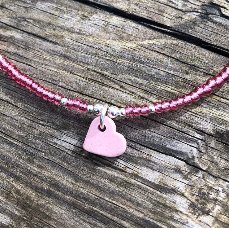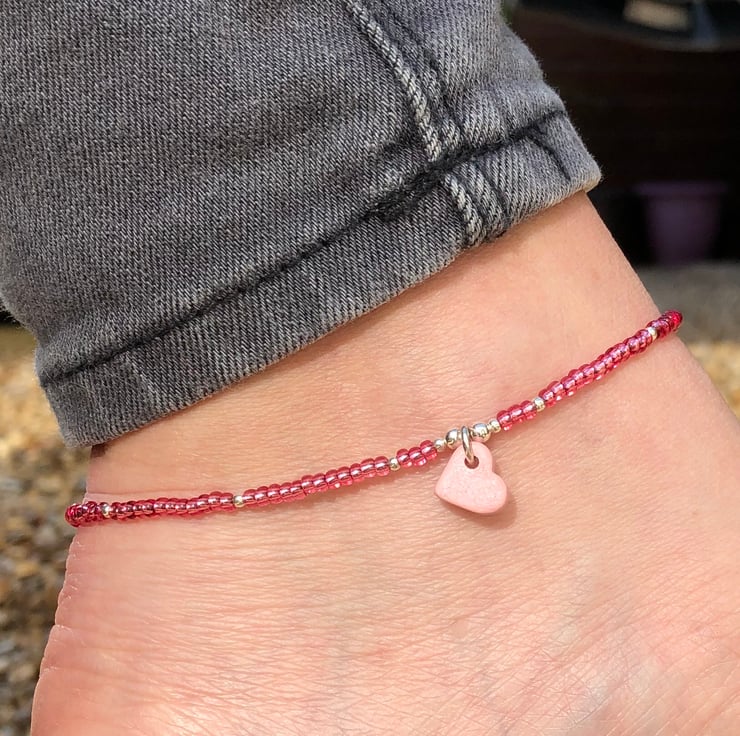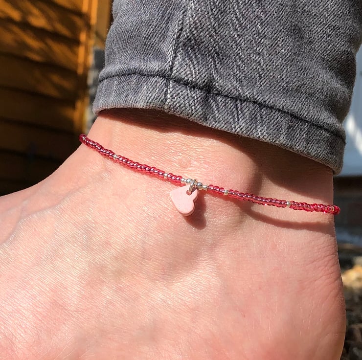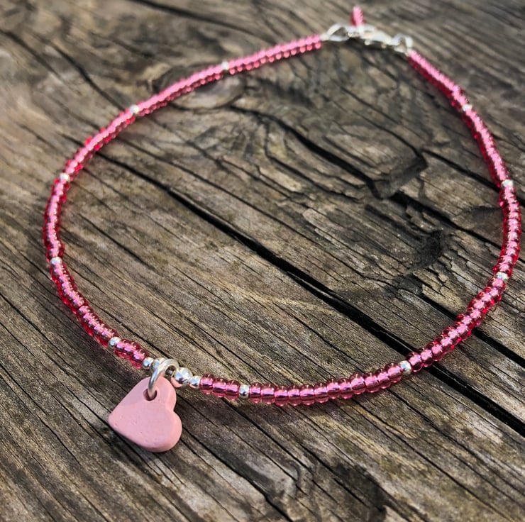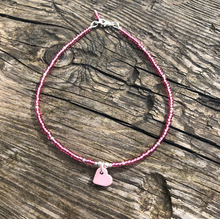 Pink Greek heart, seed bead and sterling silver anklet