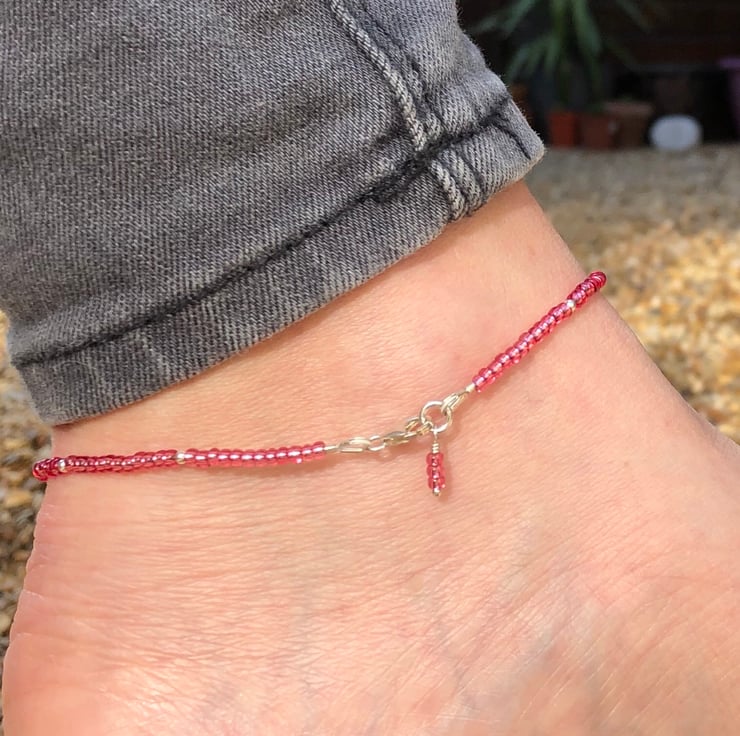 The anklet has been made using a Greek ceramic heart, seed beads, and sterling silver beads. All hand strung onto strong beading wire and finished with a sterling silver lobster clasp.