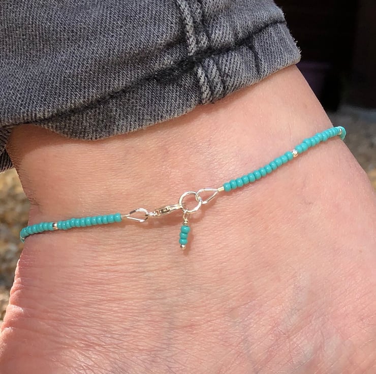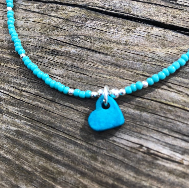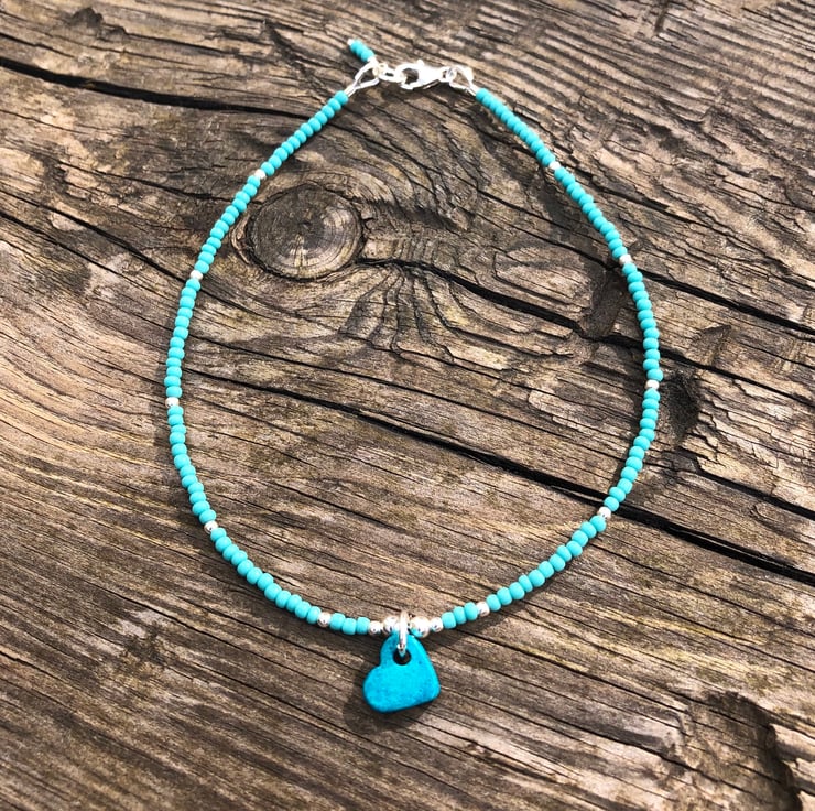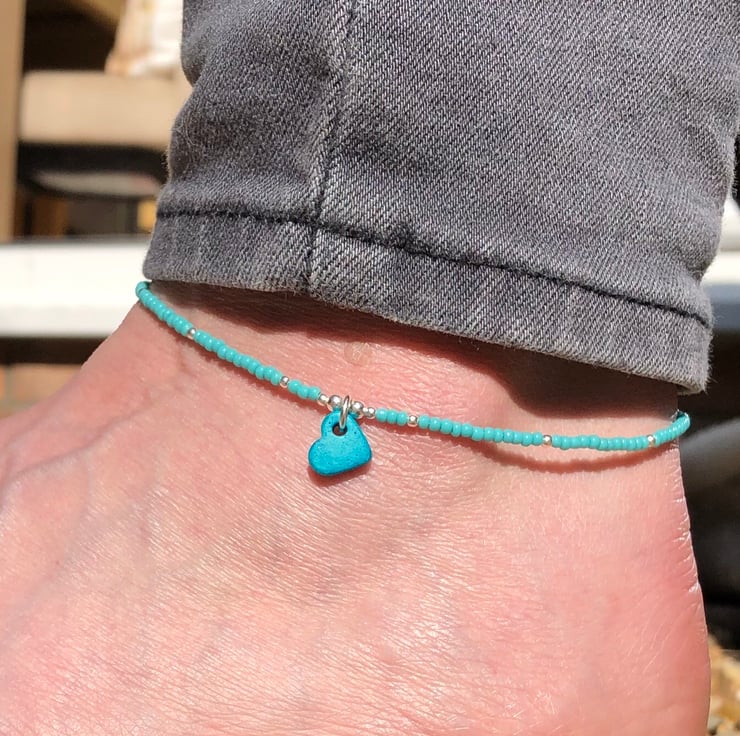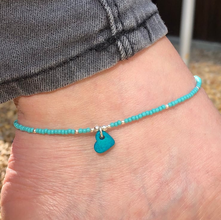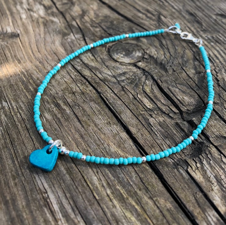 The anklet has been made using a Greek ceramic heart, seed beads, and sterling silver beads. All hand strung onto strong beading wire and finished with a sterling silver lobster clasp.