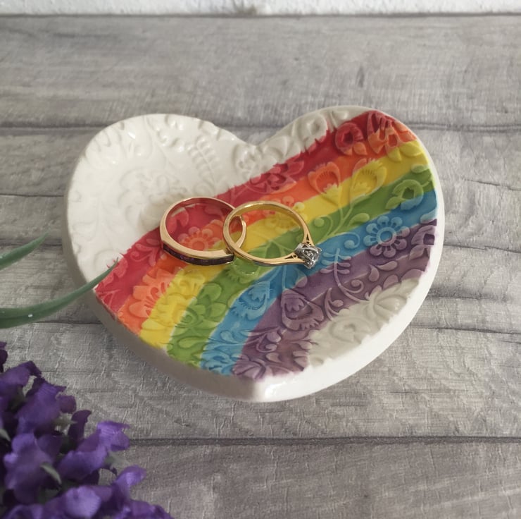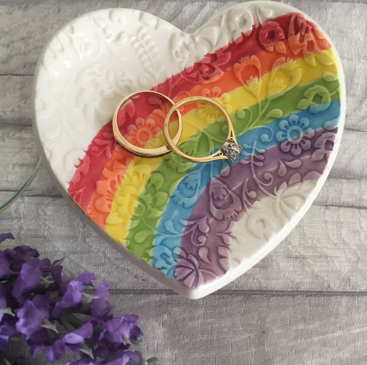 The dish has been individually made by rolling out clay and then rolling the flower pattern onto the clay. Next I cut the heart shape out using a cutter and shaped it into a dish form. Once dried the clay was then fired in my kiln. Once fired to bisque ware, I painted the rainbow design on it in underglazes, then clear glazed it and gave it it’s final firing.
