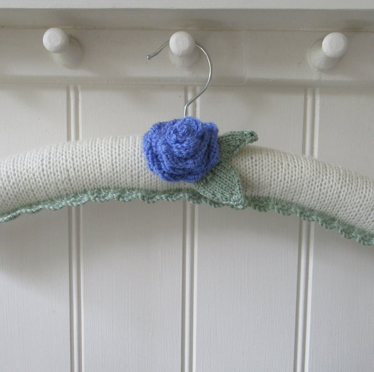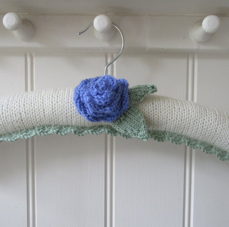 A hand knitted padded cream coat hanger with a large bluebell coloured ranunculus flower. I have generously wrapped the wooden coat hanger in polyester wadding, then knitted a cream cover in smooth stocking stitch to cover over it. The bottom edge is closed with a pale green knitted picot edging. Under the metal hook the ranunculus flower has a crocheted centre and two knitted outer rings of petals in a beautiful bluebell coloured yarn. There are two pale green leaves just tucked under the flower.