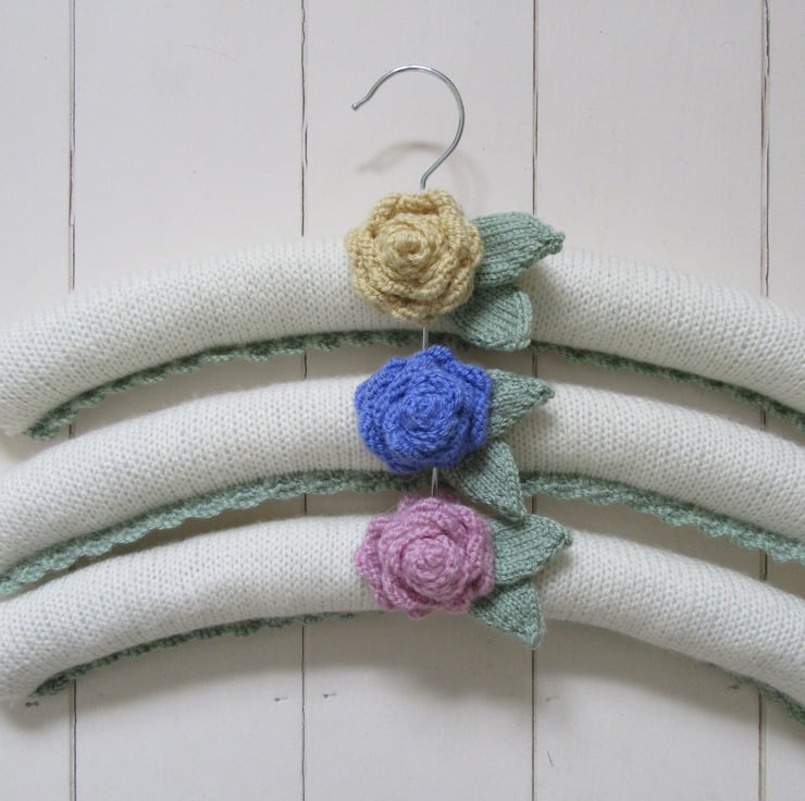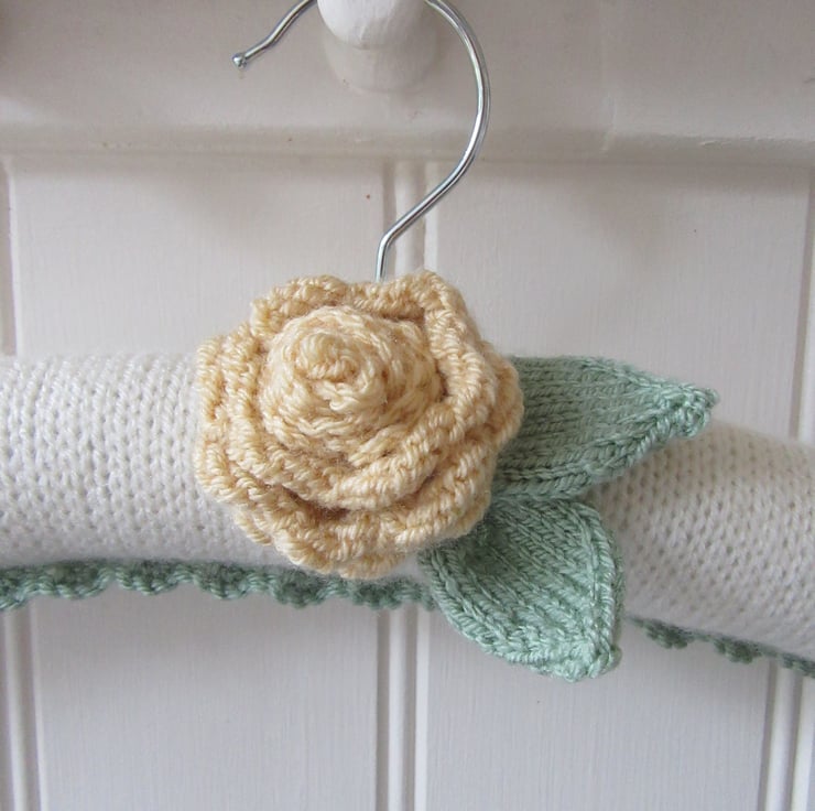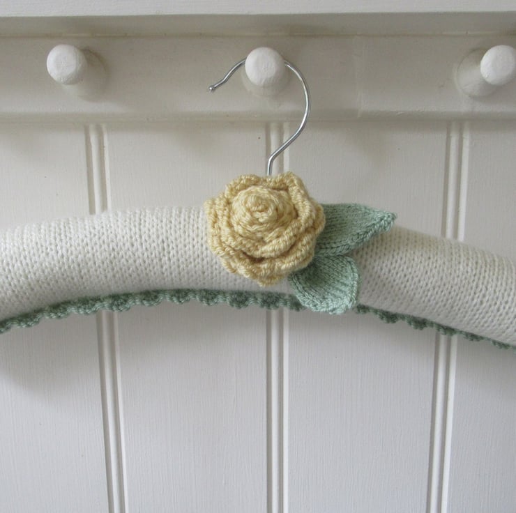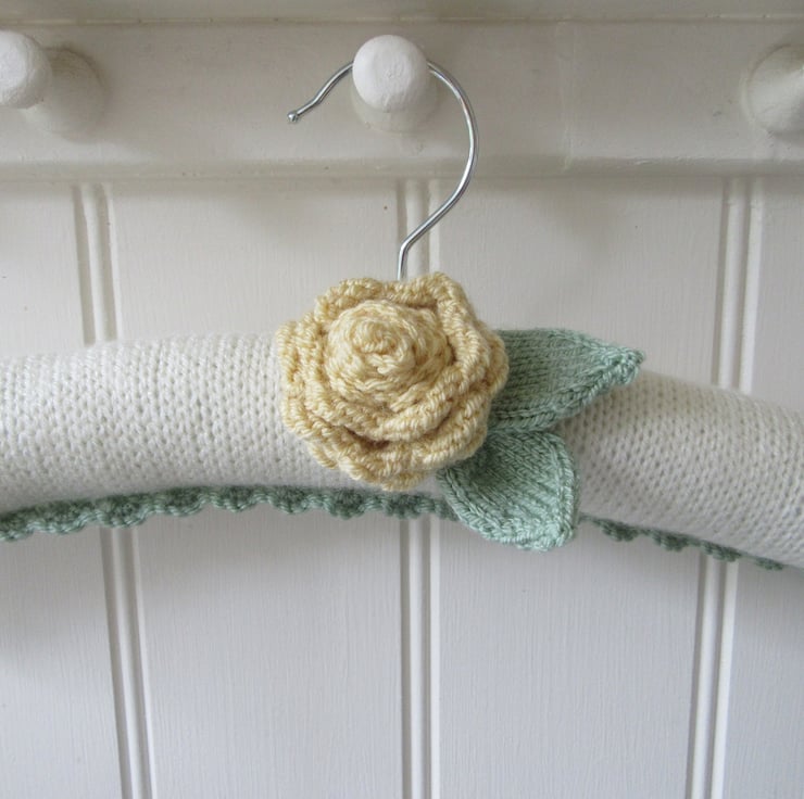 A hand knitted padded cream coat hanger with a large primrose yellow coloured ranunculus flower. I have generously wrapped the wooden coat hanger in polyester wadding, then knitted a cream cover in smooth stocking stitch to cover over it. The bottom edge is closed with a pale green knitted picot edging. Under the metal hook the ranunculus flower has a crocheted center and two knitted outer rings of petals in a beautiful primrose yellow coloured yarn. There are two pale green leaves just tucked under the flower.