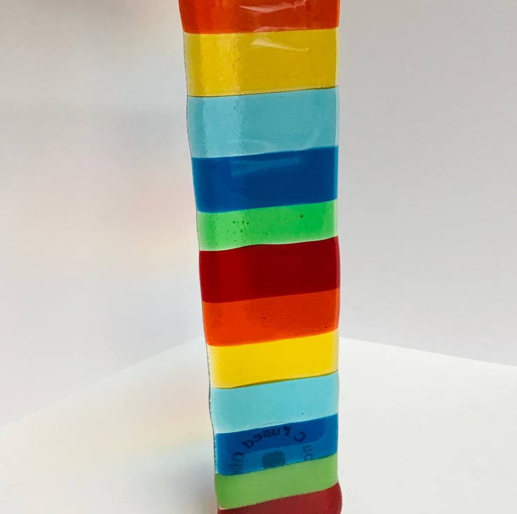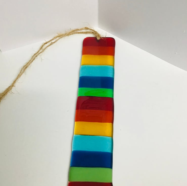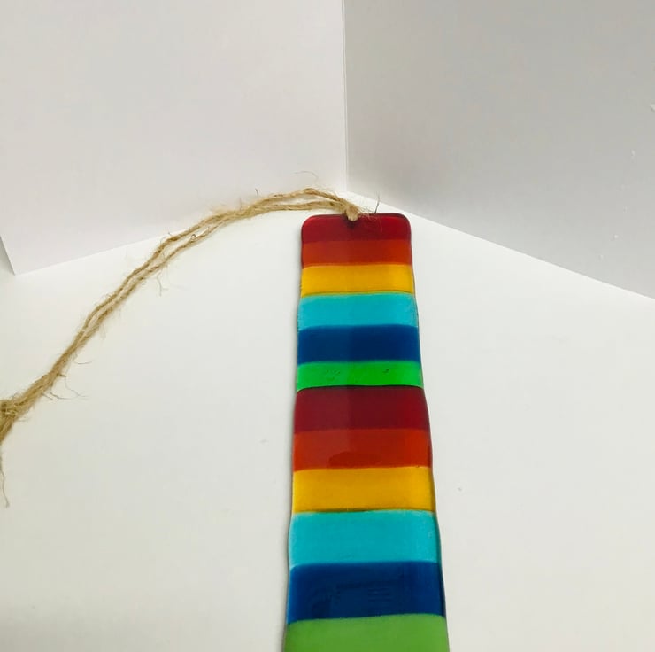 Fused glass rainbow suncatcher. 8 inches long by 2.5 inch wide . All the colours of the rainbow will cast beautiful rainbows wherever you hang it . Drilled and hung with twine it can be hung inside or outside your home .