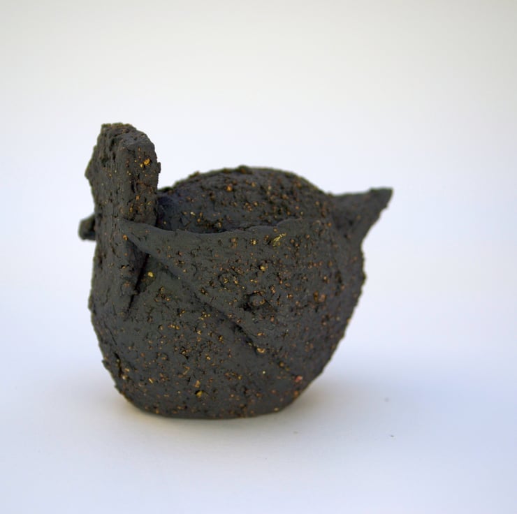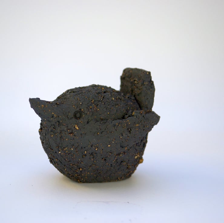 It started life as a pinch pot, had modelled wings, tail and beak added, roughed up a bit and then fired to stoneware temperature.
