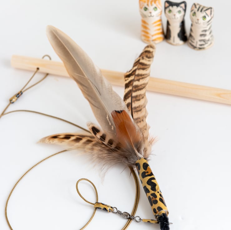 I do recommend that you don't allow kitty to play with the feather fascinator toy unsupervised - the micro cord is very strong, but won't withstand those sharp kitty teeth when they're in a determined mood and the feathers won't survive prolonged chewing, which you have doubtless already discoverd if you're visiting this listing...