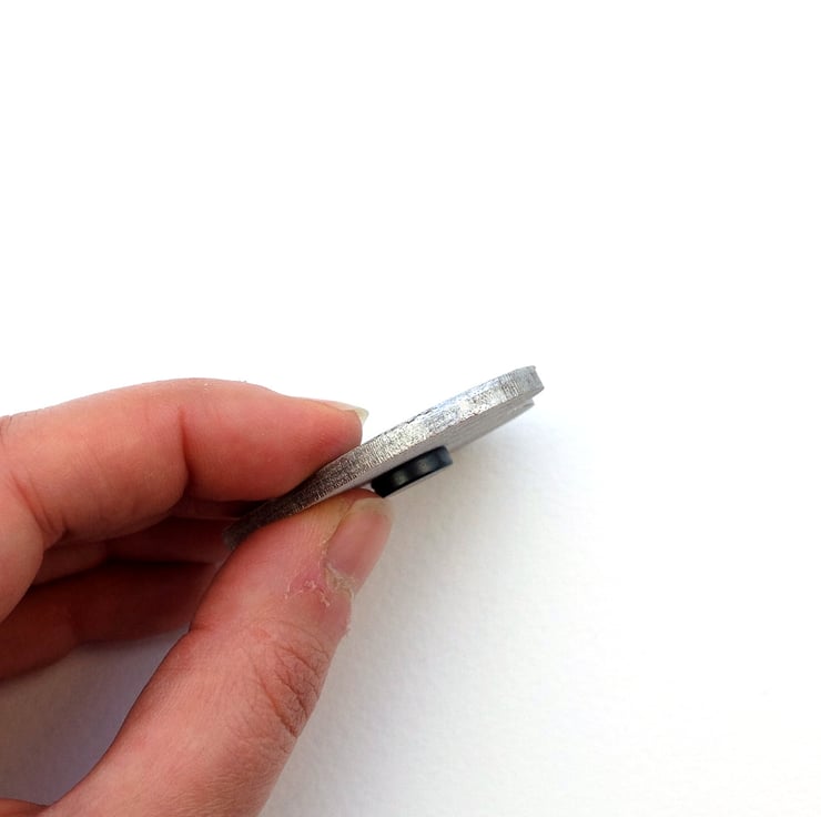 In an aquamarine, blue and silver colour way, the edges and reverse have been finished in silver acrylic. 5cm across and approx 3mm in thickness ( not including the magnet). The surface has been given a light coat of varnish.