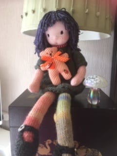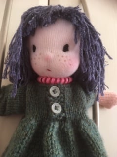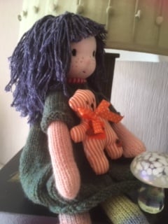 Norma just cannot wait to meet her new best friend. She is a very pretty Waldorf type doll and measures approximately 44cm (17 & a bit inches). She is hand knitted from various types of wool in a pretty multi-coloured combination of peach and green. She is wearing a pretty forest green dress with long sleeve and button fastening to the front, which can be removed. Her shoes are crocheted in gun-metal grey wool with a pretty button embellishments. She has a lovely embroidered face with a cheeky smile and button nose with lots of little freckles. Her extremely full acrylic wig cap hair is a pretty blue colour. She has a pretty spiral necklace to complete her outfit. She just cannot wait to have someone new to play with and of course she goes nowhere without her trusted little friend Teddy Albert, who seems to have a ladybird crawling on his leg!