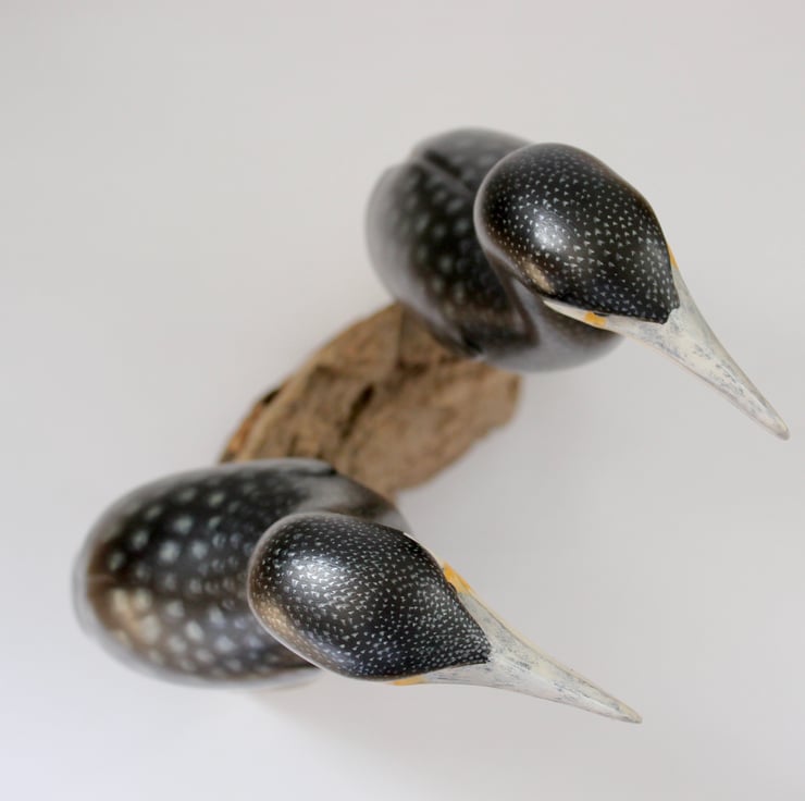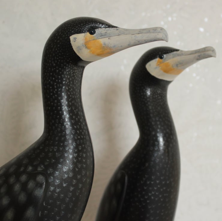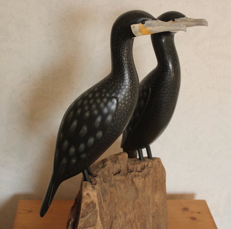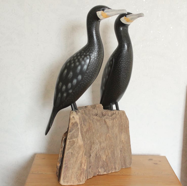 This is a large statement piece! I have hand carved a pair of cormorants and painted them with artists acrylics with pearlescent highlights to give a suggestion of feathers. They have hand tinted glass eyes and have been finished to a soft shine with wax. They are mounted on a large curved piece of driftwood.