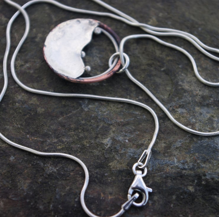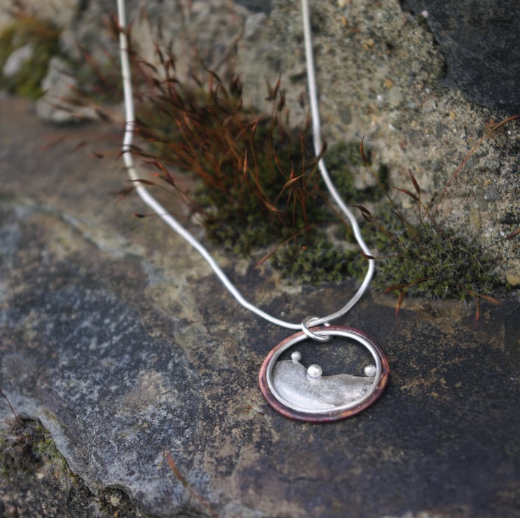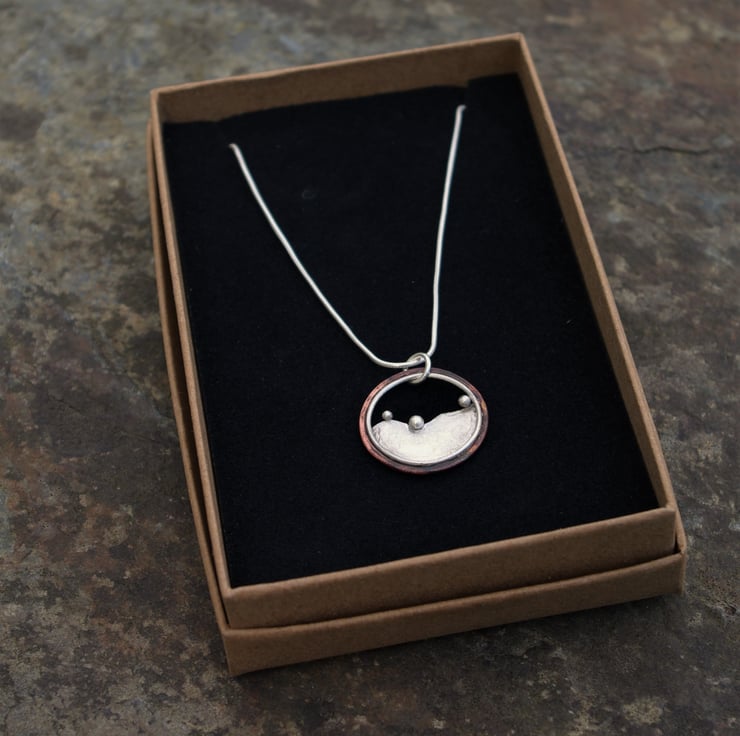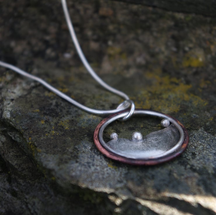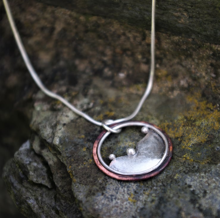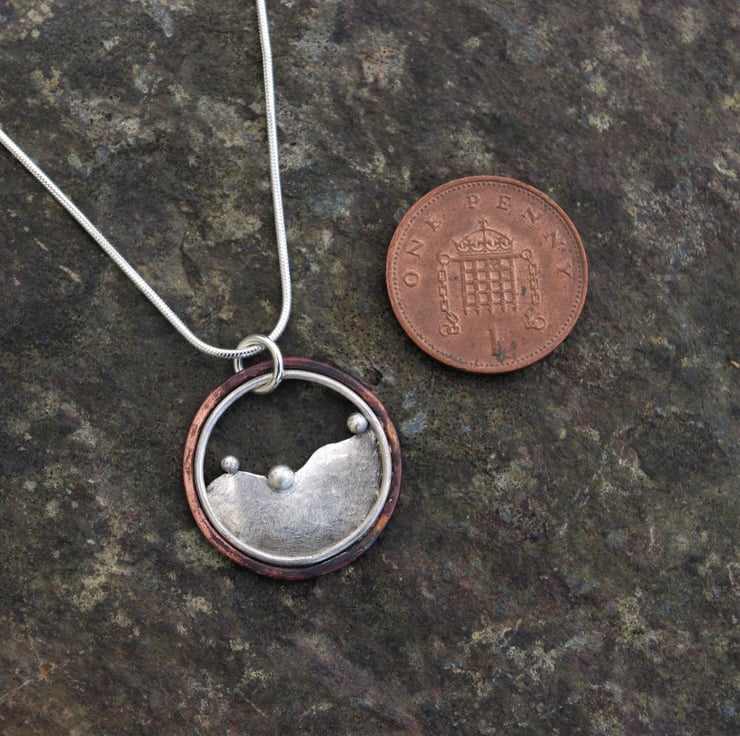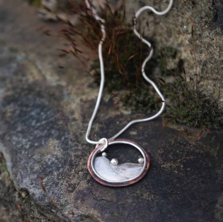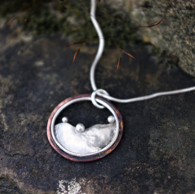 A circular pendant inspired by the hills outside my window . The 3 blobs of silver being reminiscent of the bushes dotted along the tops of the hills . The outside circle is made with copper; the deep red tones achieved by the application of heat and the inner circle is silver The 'hill' shape is made from sterling silver and it has a matt/frosted, aged texture to contrast with the copper.