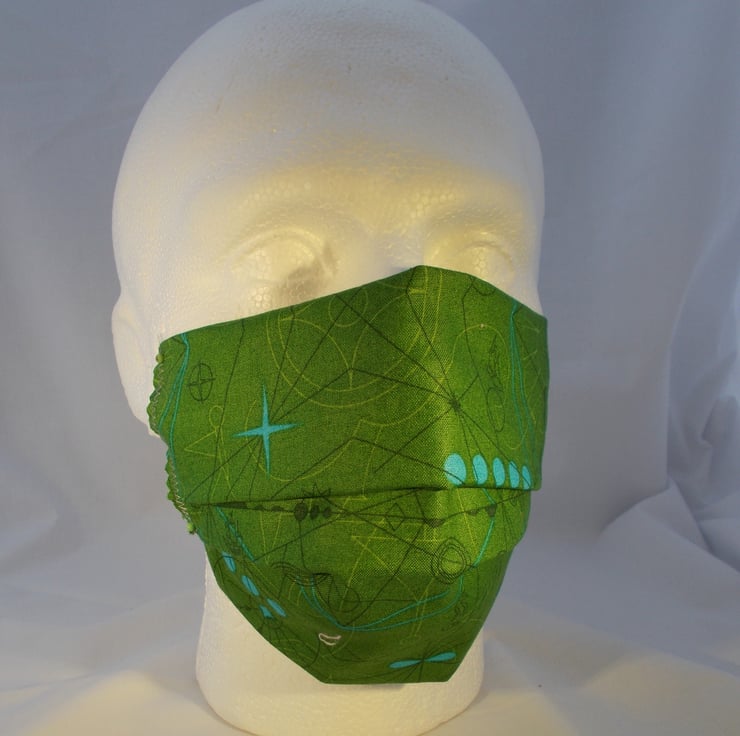 This is a washable double fabric face covering with interior pocket if required It is made from 100% cotton and comes with pre threaded cotton ties or elastic ties for you to adjust to size, please make your choice in the selection option.