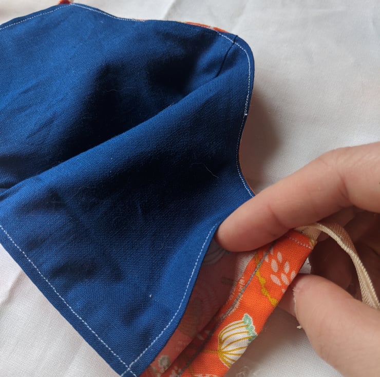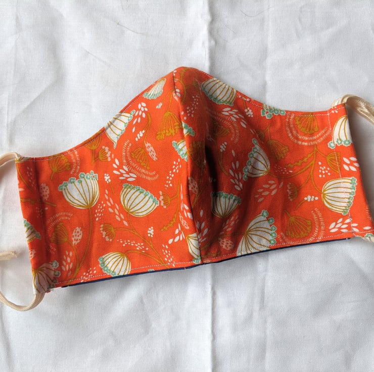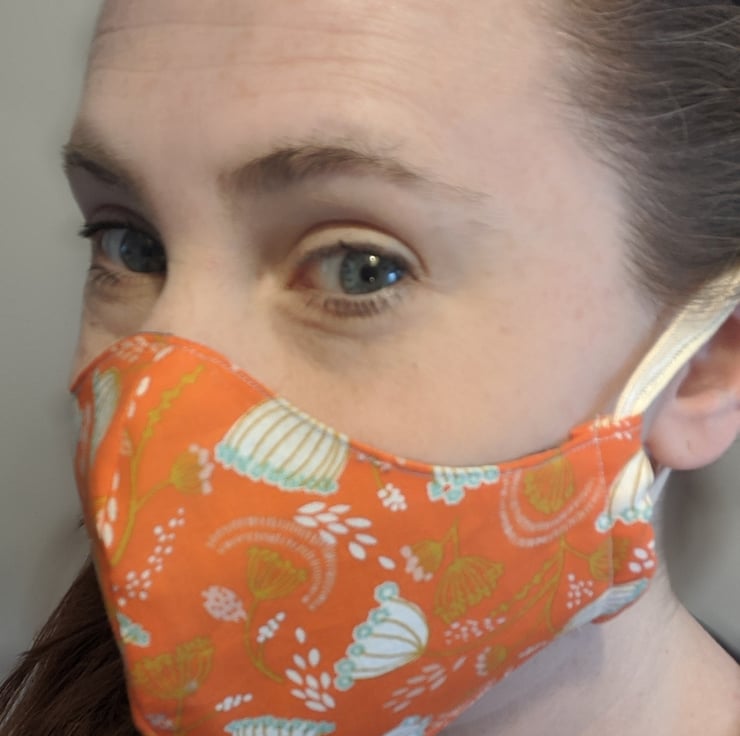 This is a 100% cotton face mask with elastic ties. It provides full coverage of the nose and mouth with a lightweight breathable fabric. The elastic used is fold-over elastic of the type used in lingerie, which is softer and more comfortable than ordinary elastic. The ties of the elastic are adjustable for a better fit. The lining is open, to allow insertion of a filter if desired (see photos).