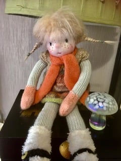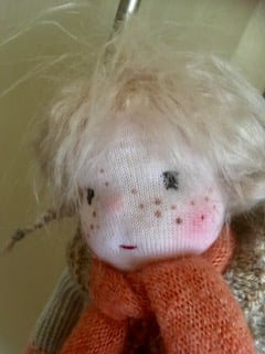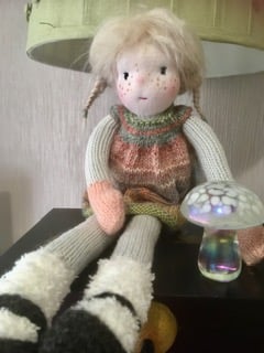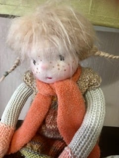 Hilda just cannot wait to meet her new best friend. She is a very pretty Waldorf type doll and measures approximately 40cm (15 and a bit inches). She is hand knitted from pretty pastel blue natural cotton wool. She is wearing a pretty multi-coloured wool dress under a harvest coloured wool cardigan, which can both be removed. She has a peach coloured woollen scarf to keep her warm in winter. Hopefully if we have a fabulously warm summer she wont need it. Her shoes are crocheted in black wool with a pretty button embellishment over white fluffy socks. She has a lovely embroidered face with a cheeky smile and button nose with lots of little freckles. Her extremely full acrylic wig cap hair which she wears in plaits is a pretty white/blonde colour which can be rather unruly , so she needs it gently brushed every so often!