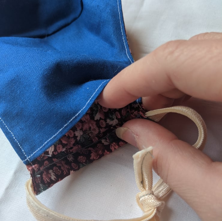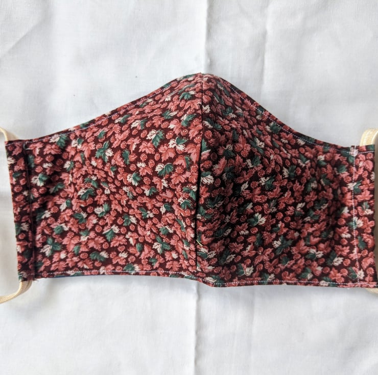 This is a 100% cotton face mask with elastic ties. It provides full coverage of the nose and mouth with a lightweight breathable fabric. The elastic used is fold-over elastic of the type used in lingerie, which is softer and more comfortable than ordinary elastic. The ties of the elastic are adjustable for a better fit. The lining is open, to allow insertion of a filter if desired (see photos).
