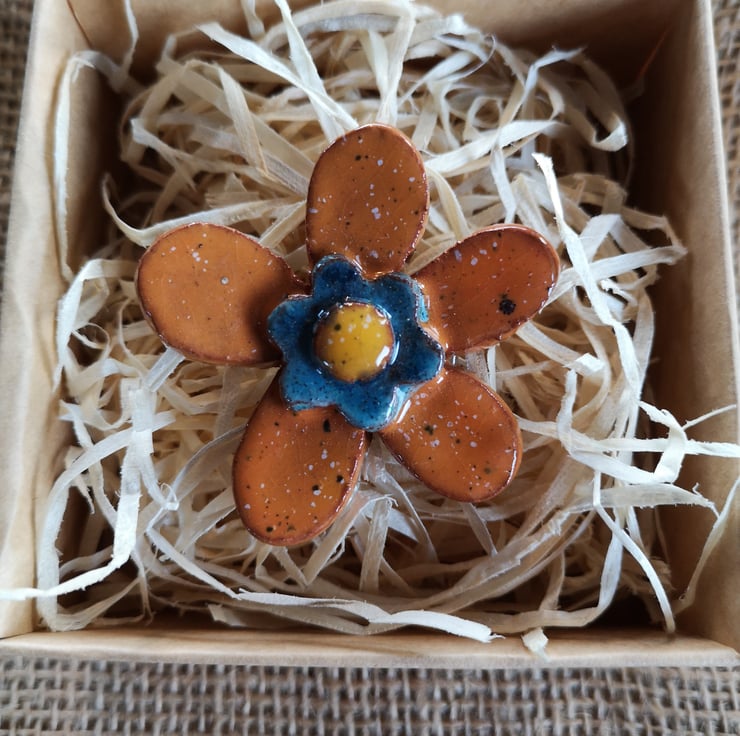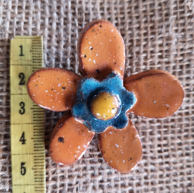 This Brooch is about 5cm wide from petal to petal and is completely unique, I make and decorate all of my brooches individually. This brooch is glazed with a deep speckled red and duck egg blue glaze.