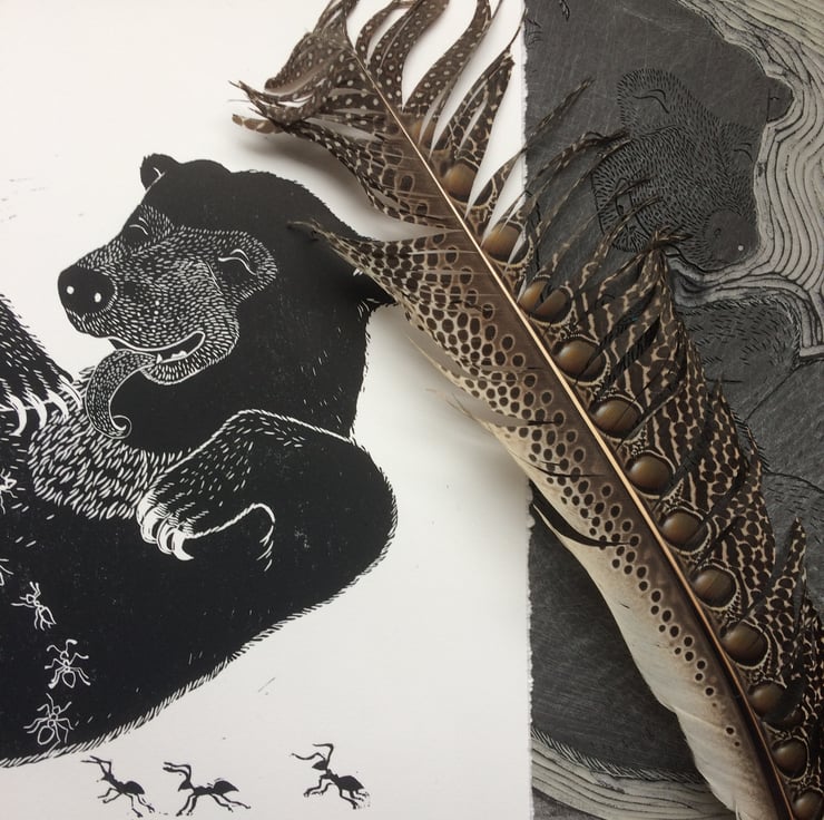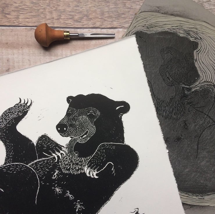 This is an original open edition Lino print pressed by hand in my home studio. The printed area measures approximately 30cm x 30cm and is printed on Zerkall archive paper (38 cm x 38cm ) in black water based ink. I’m donating £30 to Cikananga Wildlife Rescue Centre in Indonesia who care for several sun bears and many other wild animals (please read all about the centre further on). I'm on a rolling print run with this one so please bear with me while I print, press and dry!! Prints will be posted out as soon as I am able. I hope you like it and I'll be pleased as punch if you order a copy!