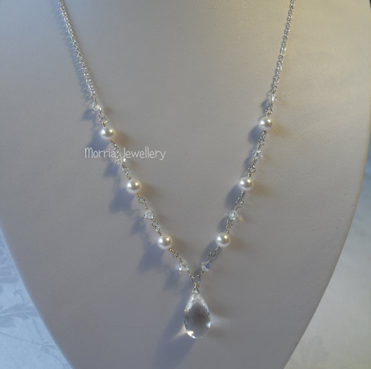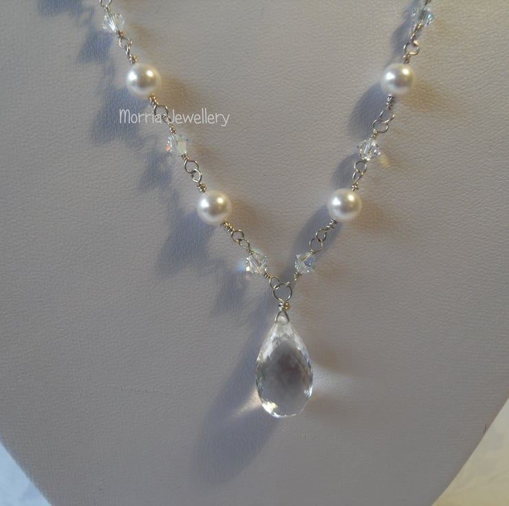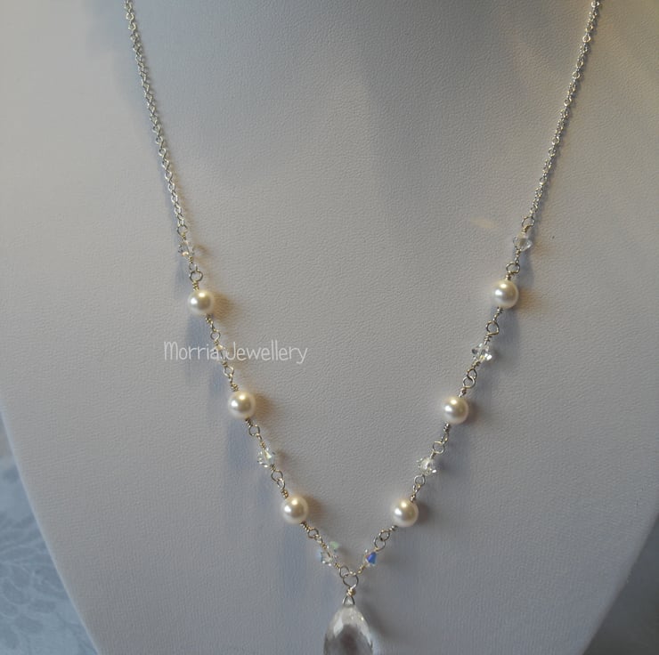 A beautiful, faceted, rock crystal teardrop pendant hangs from a sterling silver chain adorned with white high end crystal pearls and crystals.