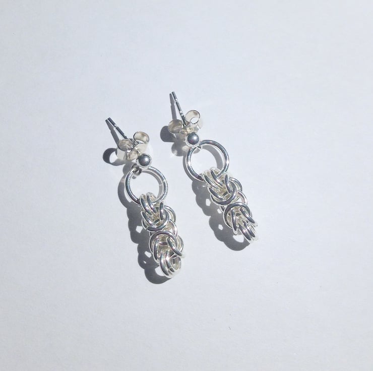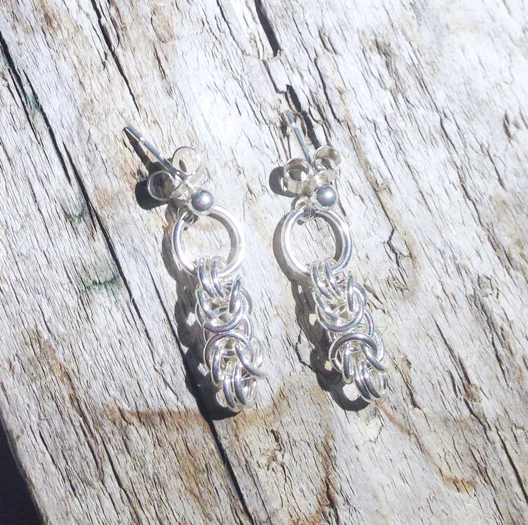 These lovely earrings are hand crafted from sterling silver jump rings in a byzantine design.