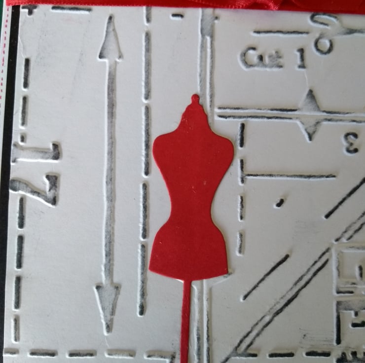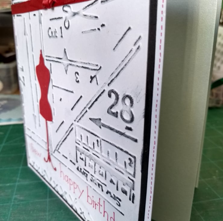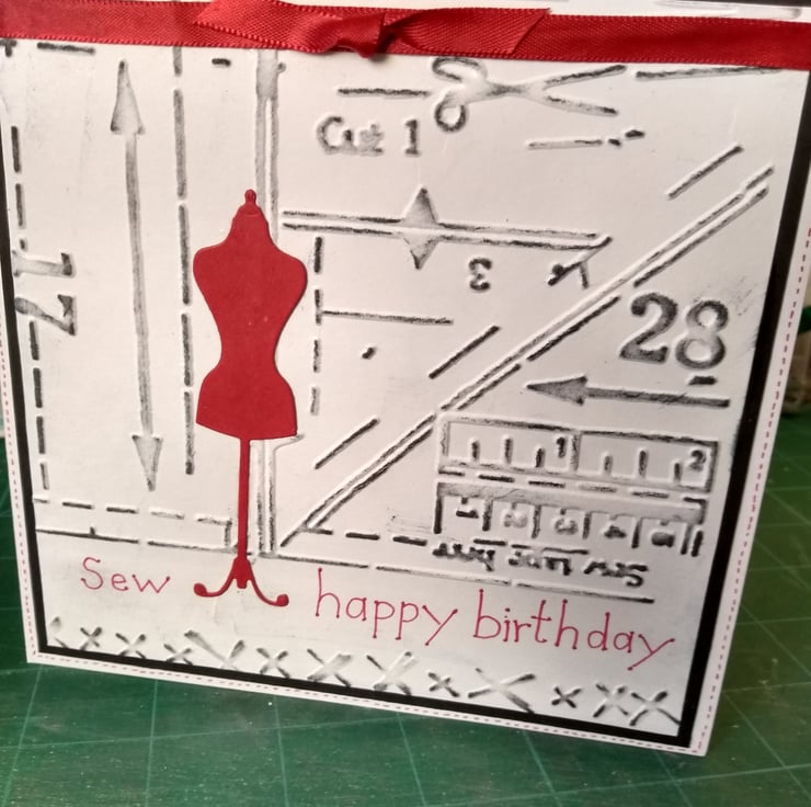 A completely handmade and uniquely designed card. Consisting of quality pristine white card which has been embossed with a sewing pattern design. Highlit in black ink. Mounted onto black card and then onto white card. A mannequin die cut from red card. Sew happy birthday handwritten in red ink. Finished off with red ribbon and bow