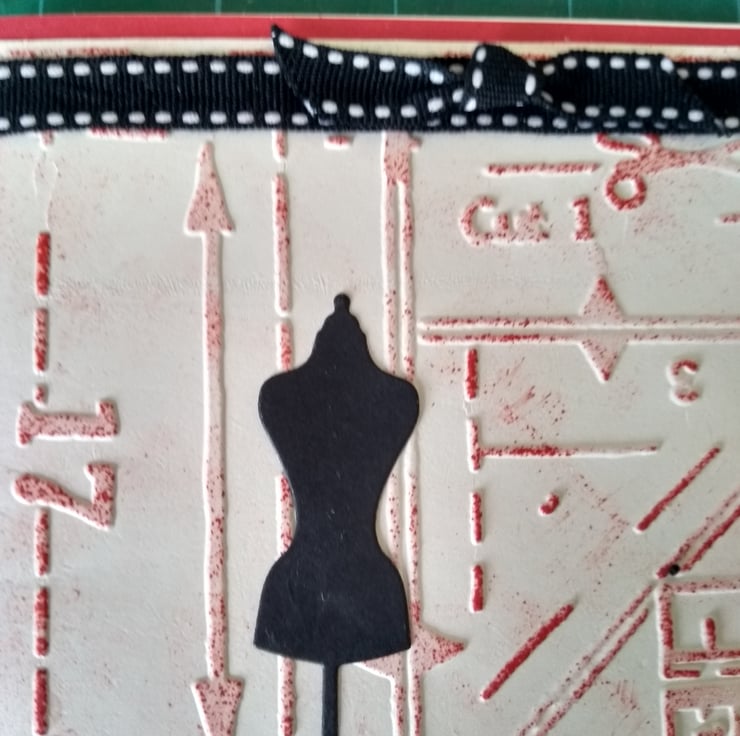A completely handmade and uniquely designed card. Consisting of cream card which had been embossed with a sewing pattern design. Mounted onto red card and then onto quality cream card. Sew happy birthday handwritten in black ink. Finished off with a mannequin die cut from black card and a vo ordinating black ribbon and bow