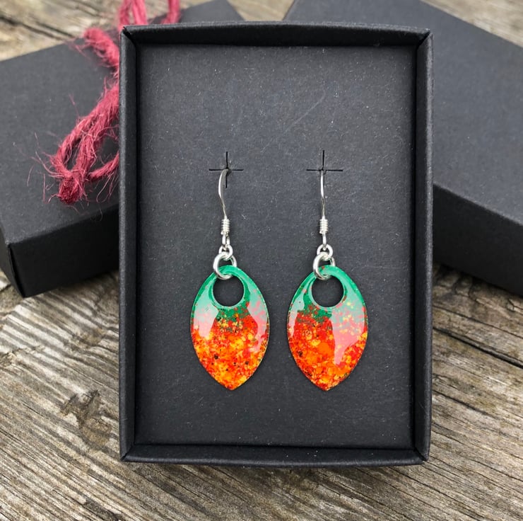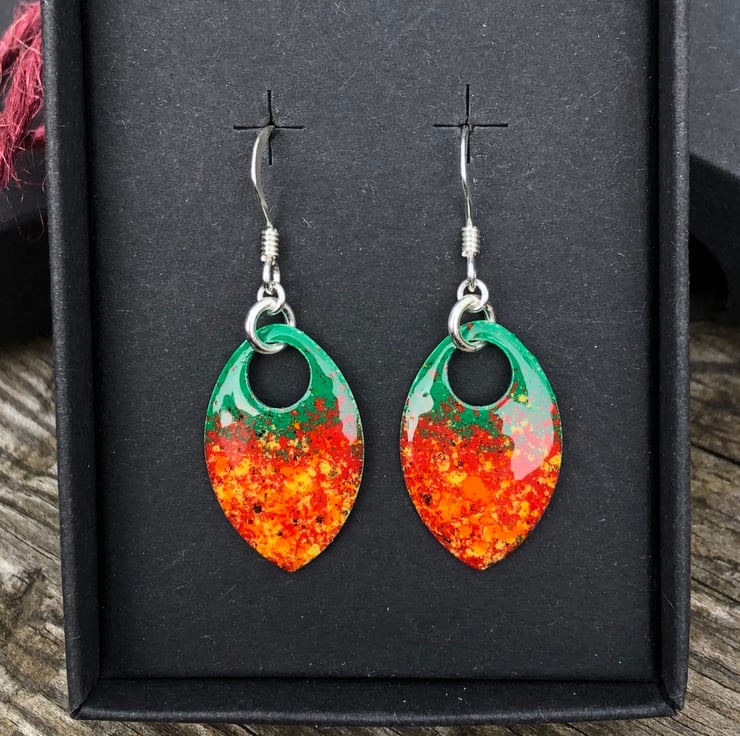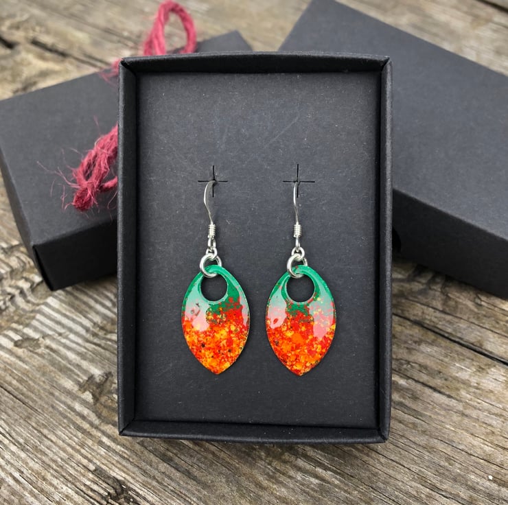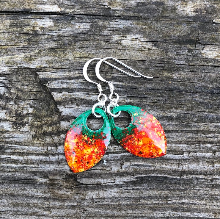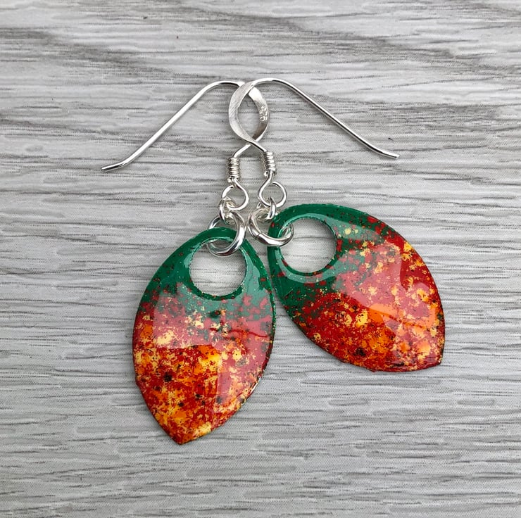 Super light weight aluminium scales have been hand enamelled in a number of layers of cold enamel. These hang from sterling silver fish hook earrings using sterling silver jump rings. The back of the scale remains blank, silver in colour.