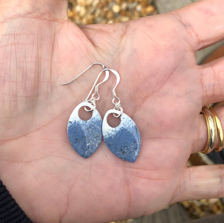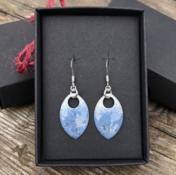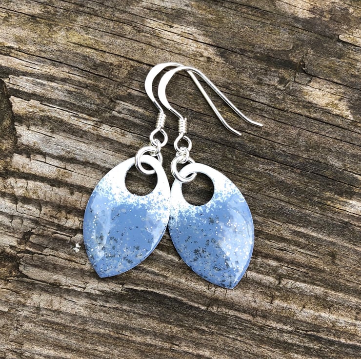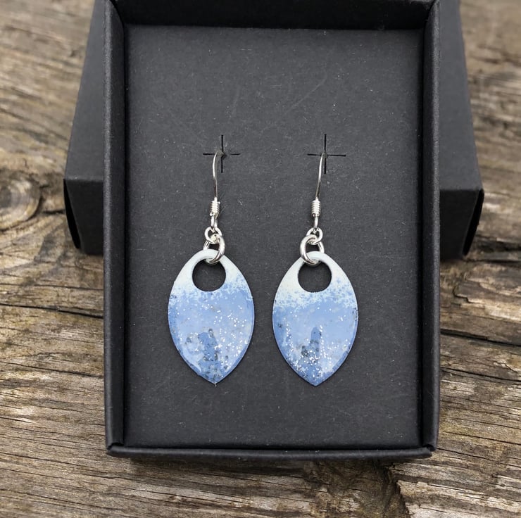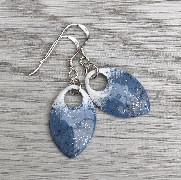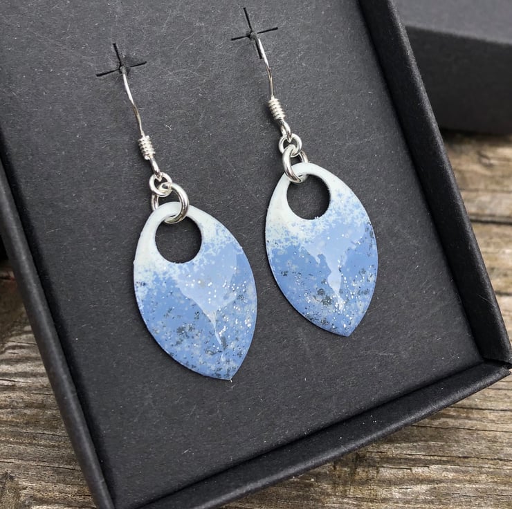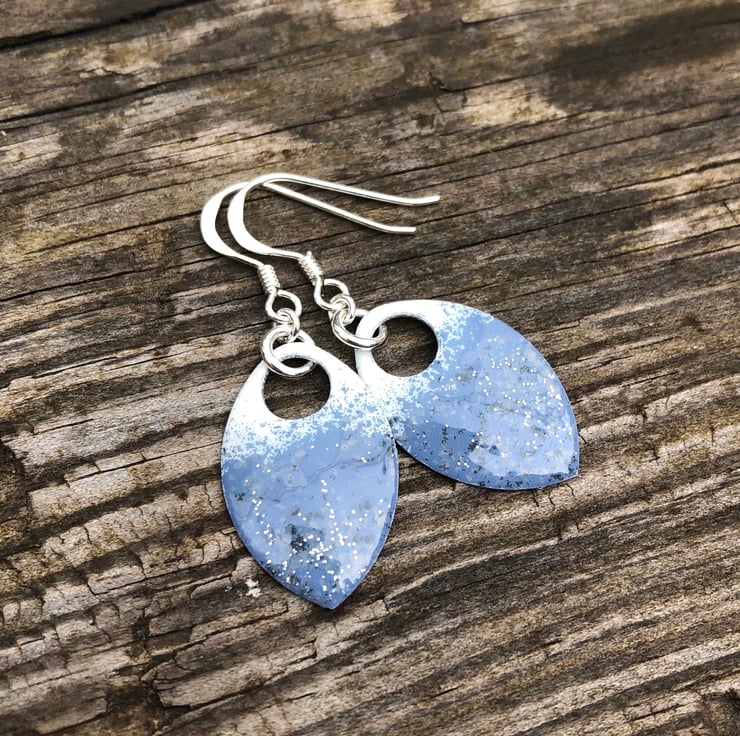 Super light weight aluminium scales have been hand enamelled in a number of layers of cold enamel. These hang from sterling silver fish hook earrings using sterling silver jump rings. The back of the scale remains blank, silver in colour.