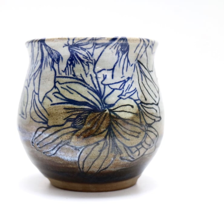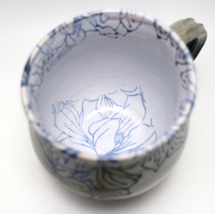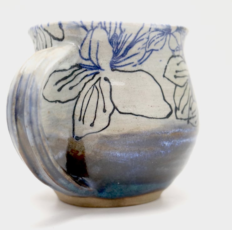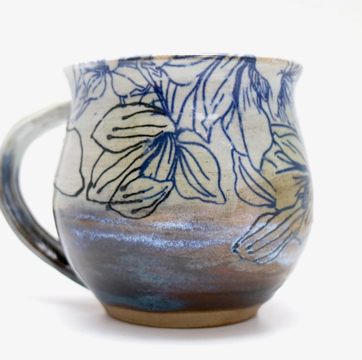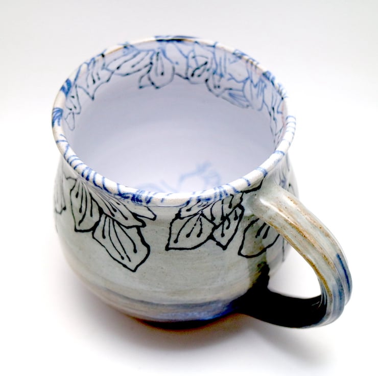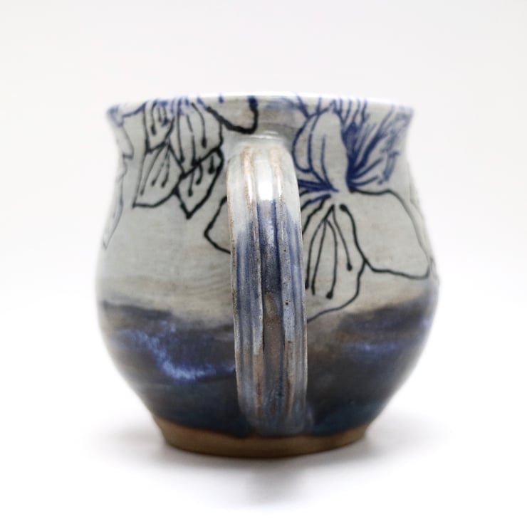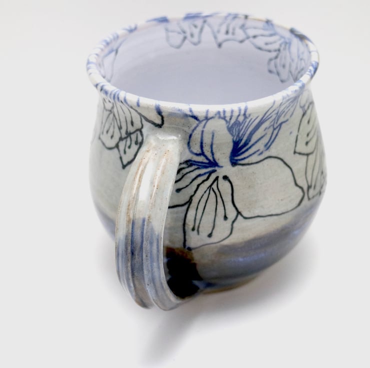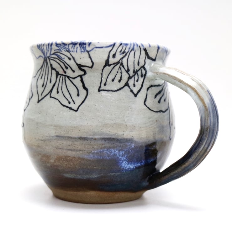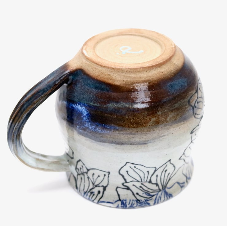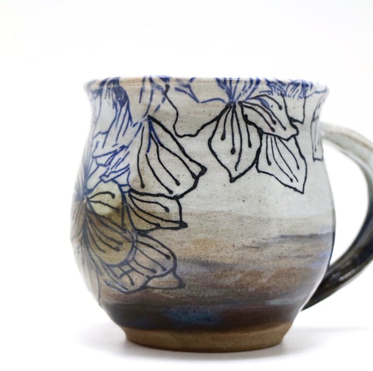 A wheel thrown stoneware mug with a sprinkling of petals around the rim.