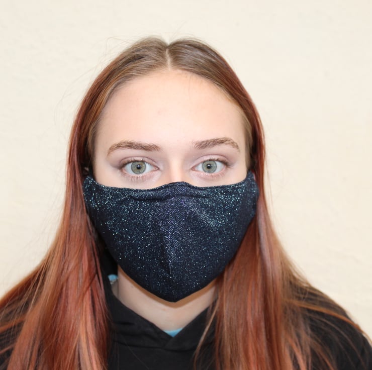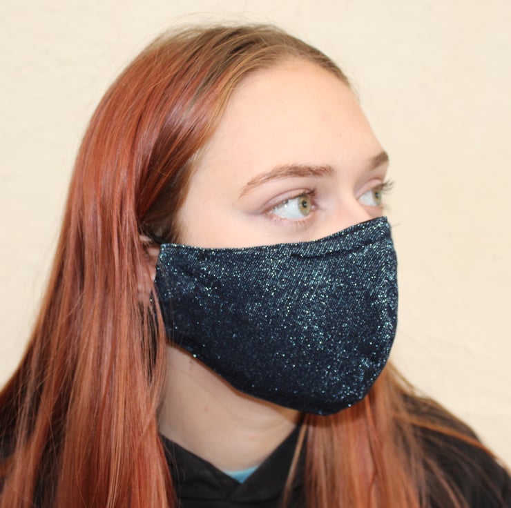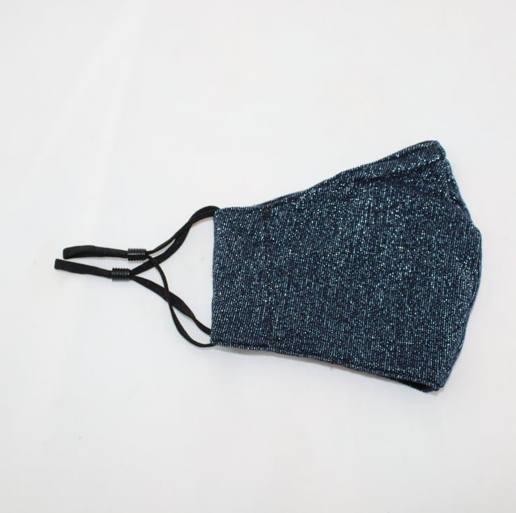 Eco fully washable reusable Fabric Mask, made in a blue sparkly fabric remnant with a black cotton lining, perfect for the party season.