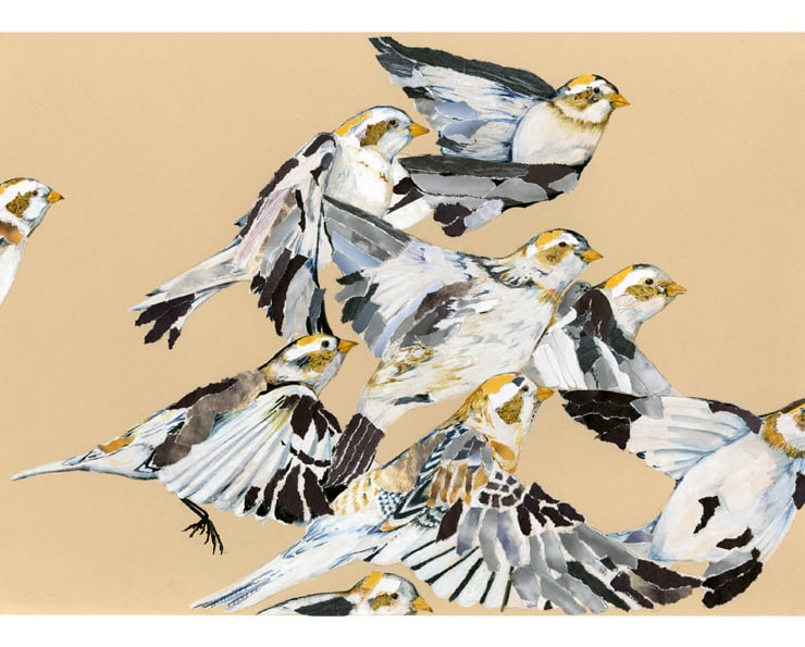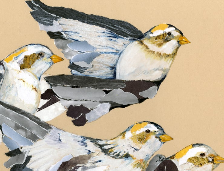 This is a piece of work depicting Snow Buntings. It is mixed media, blending pencil, watercolor and collage.
