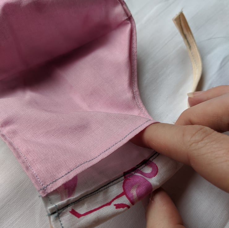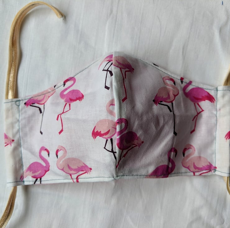 This is a 100% cotton face mask with elastic ties. It provides full coverage of the nose and mouth with a lightweight breathable fabric with a flamingo pattern. The elastic used is fold-over elastic of the type used in lingerie, which is softer and more comfortable than ordinary elastic. The ties of the elastic are adjustable for a better fit. The lining is open, to allow insertion of a filter if desired (see photos).