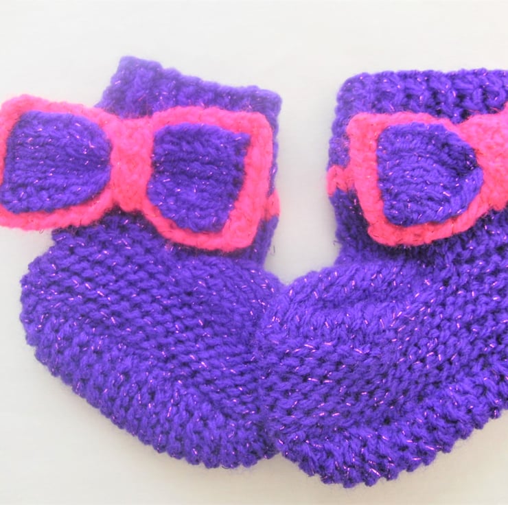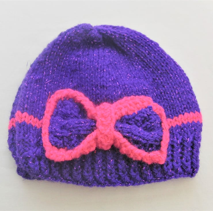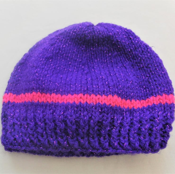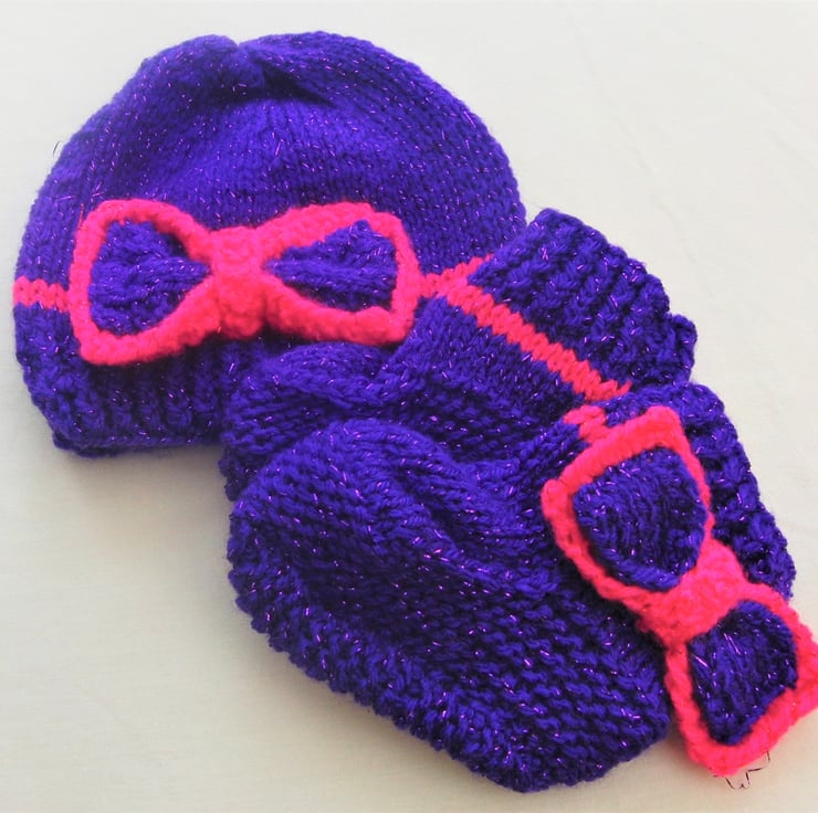 Stunning Hat set including a hat and a pair of bootees. The set is made to fit a child approximately 0 - 3 months old and is knitted in double knitting weight yarn in a purple glitter yarn and a shocking pink yarn.