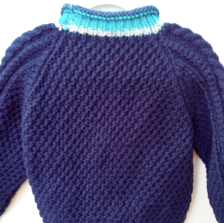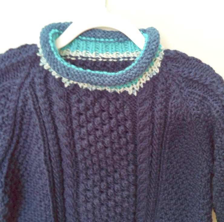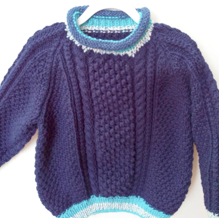 Lovely child's cable patterned jumper hand knitted in aran yarn for additional warmth. The jumper is not in stock but it can be made for you in a colour of your choice with either a roll neck, a collar or a round neck. Available sizes are shown at the bottom of this listing and please state the colour required when you order. The processing time for this jumper will be approximately 1 - 2 weeks to produce and post to you.