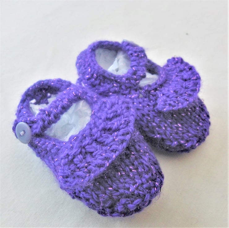 Glittery purple pair of hand knitted girls shoes. The shoes are made to fit a child approximately 0 - 6 months old and they are hand knitted in double knitting yarn.