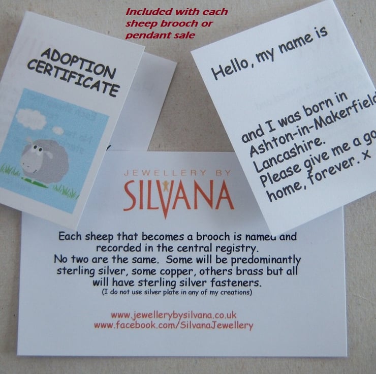 All my sheep, ram and alpaca brooches are named, just to be even more individual than they already are. A little adoption leaflet is provided. The silver alpacas all begin with W and this one is Winona.
