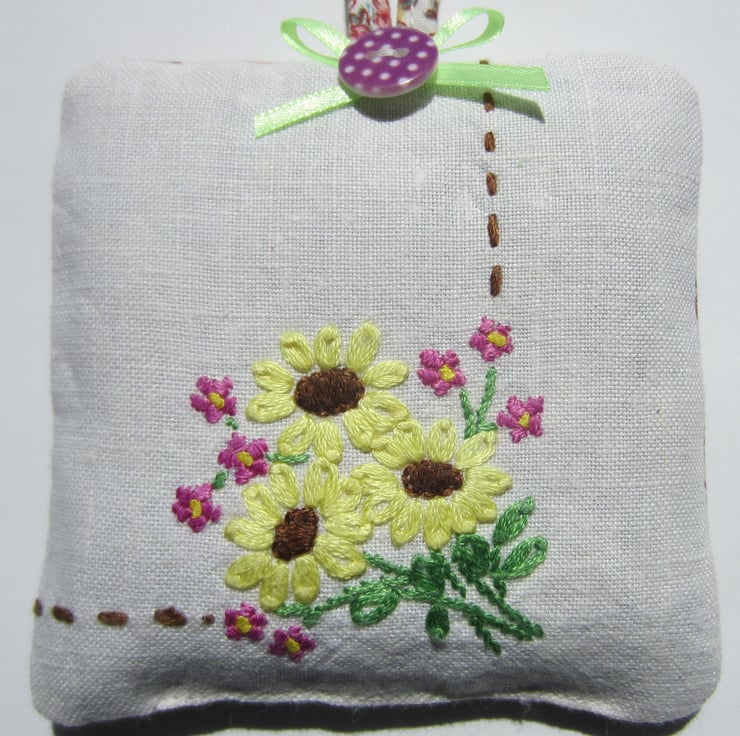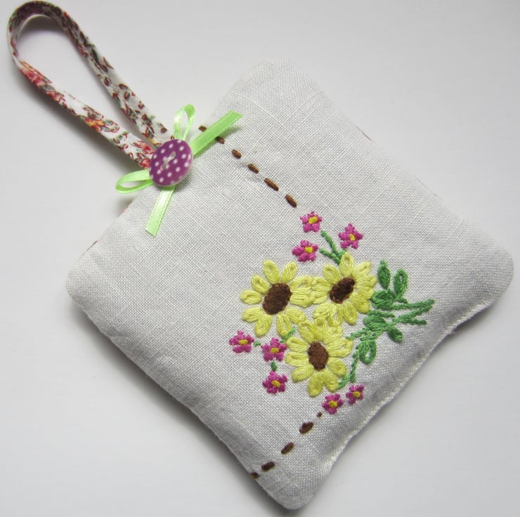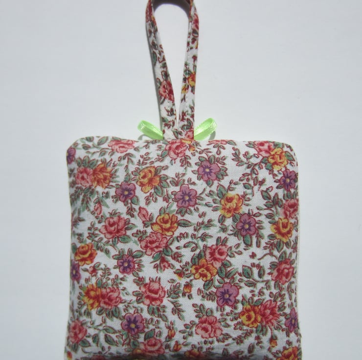 Hanging lavender sachet with a vintage embroidered front in a pretty flower design with an added green ribbon bow and button. . The back and loop are in a coordinating floral fabric.