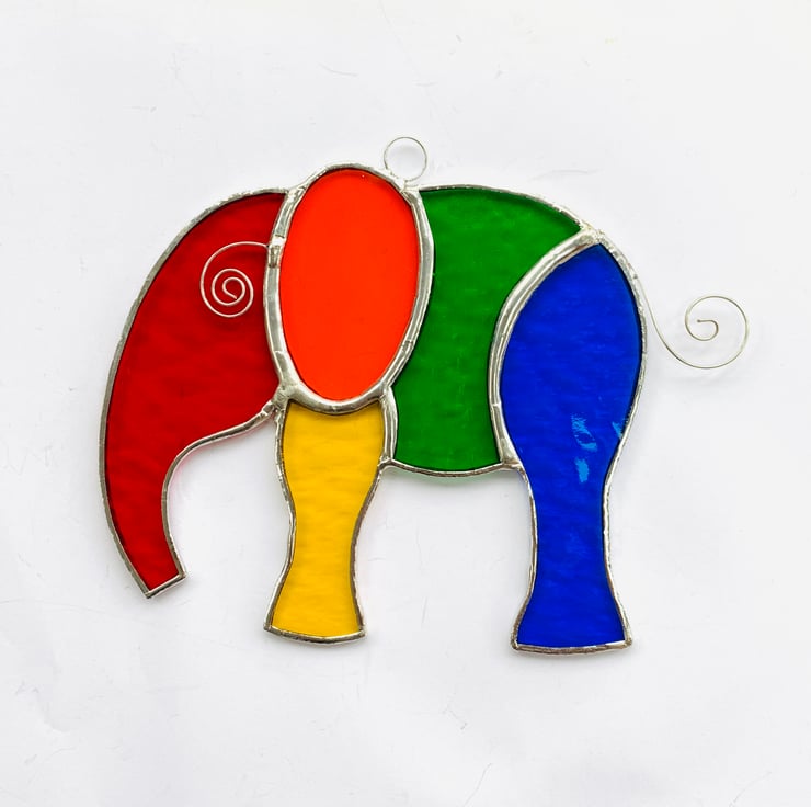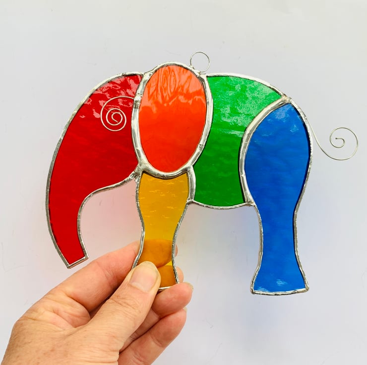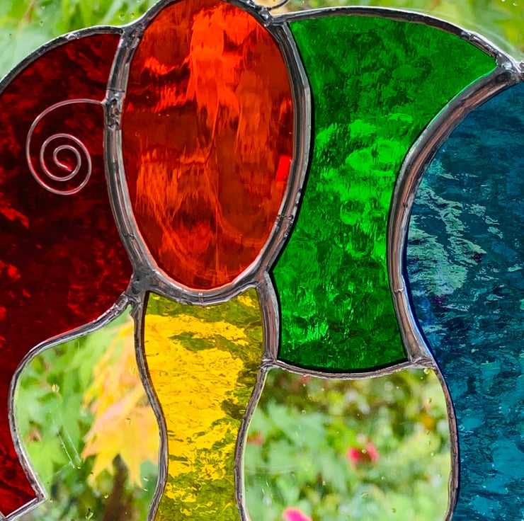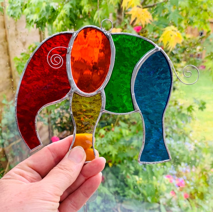 This elephants measure 14.5 cms x 13 cms and has been made from a selection of 5 different types of brightly coloured stained glass, almost a rainbow, which will definitely brighten your window.