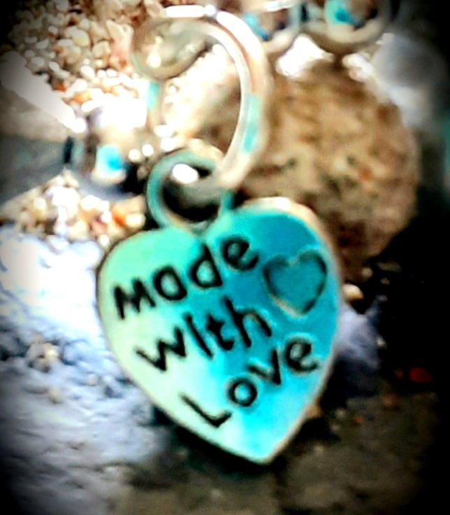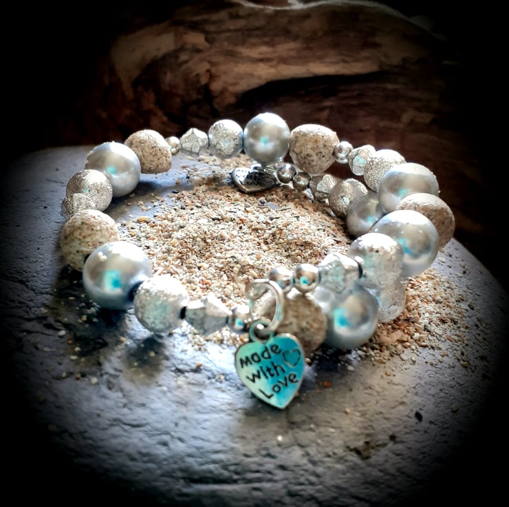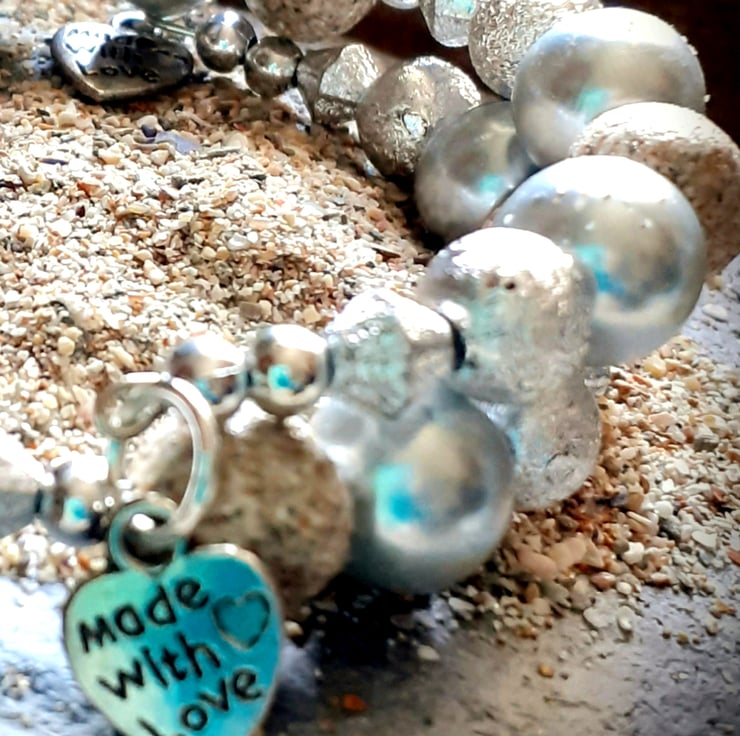 This is a unique sand bead bracelet which includes handmade sand beads using sand from Fistral beach in Newquay Cornwall...a very popular surfing beach .The beads are moulded and shaped set hard and protected then threaded on to a memory wire bracelet coil together with silver tone acrylic beads..and finished with little heart charms with the inscription "made with love" ...this bracelet is a very pretty bracelet and also a very dressy bracelet so could be worn for various occasions .. due to it being made with memory wire it is expandable so would fit most adult wrist