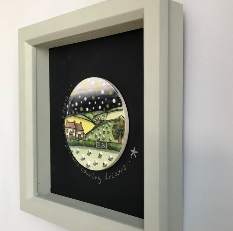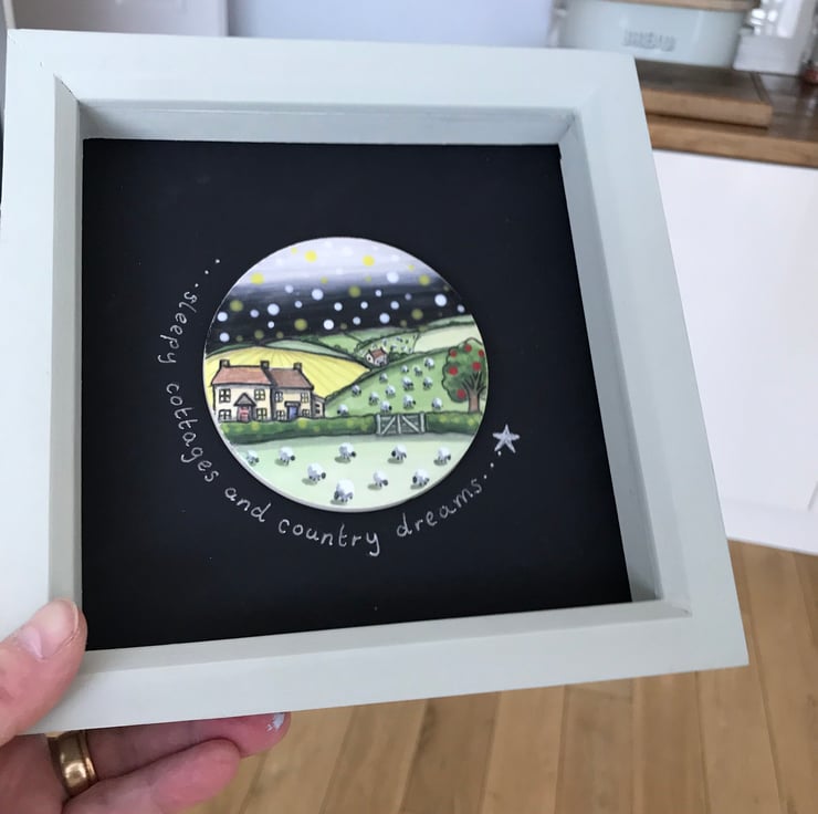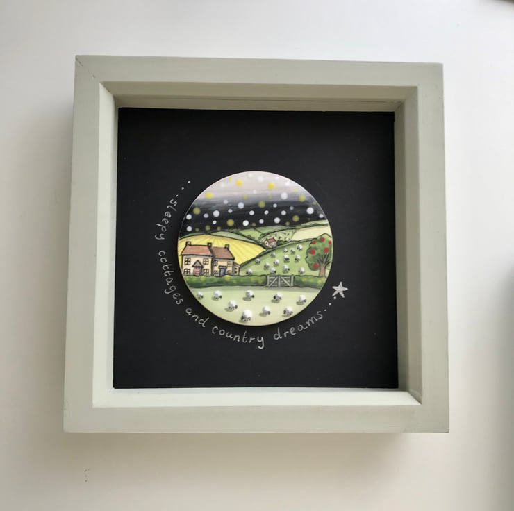 This is a unique painting of a starry night country scene. Hand painted in bright glazes on an earthenware tile and kiln fired. With a little quote written in silver “sleepy cottages and country dreams” finishes off this cute picture. Mounted on black card and box framed.