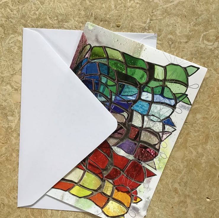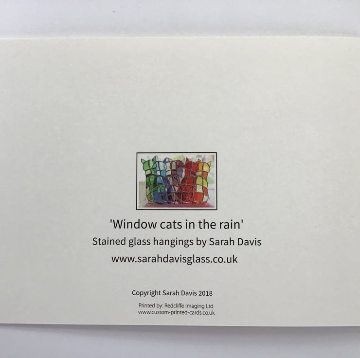 A high quality printed greetings card with a vibrant image of my 'Window cats' stained glass. The 'Window Cats' is a colourful collection of six stained glass cat hangings standing watching the rain.