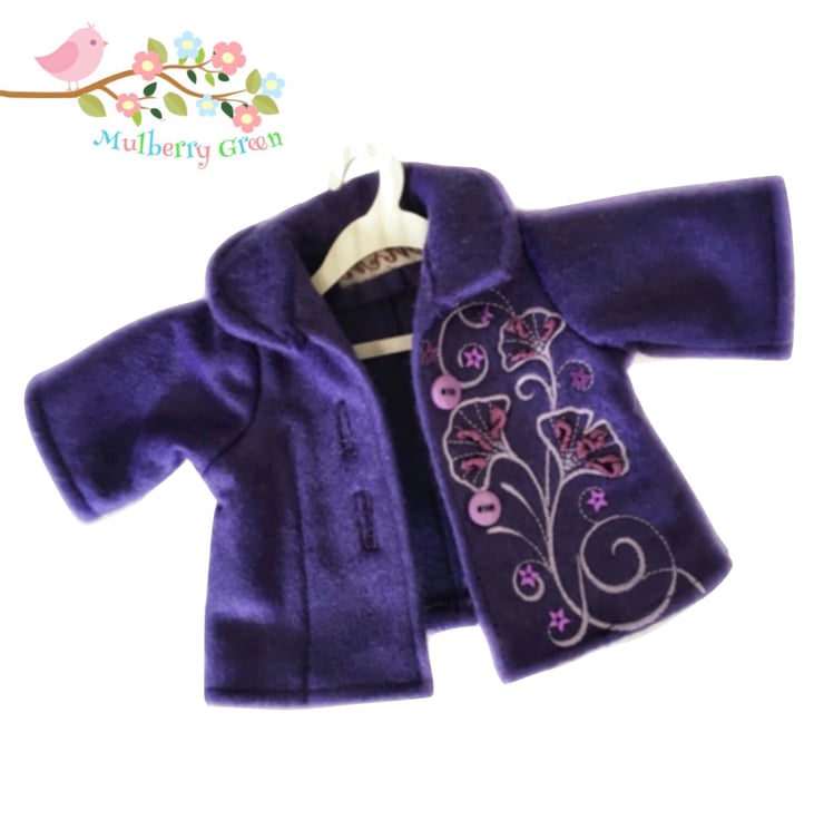A gorgeous little purple tailored jacket to fit the Mulberry Green dolls. The jacket is machine and hand embroidered and fastens with two little green buttons. It comes on a little wooden hanger.