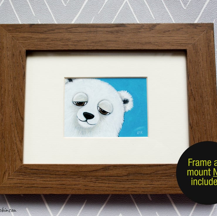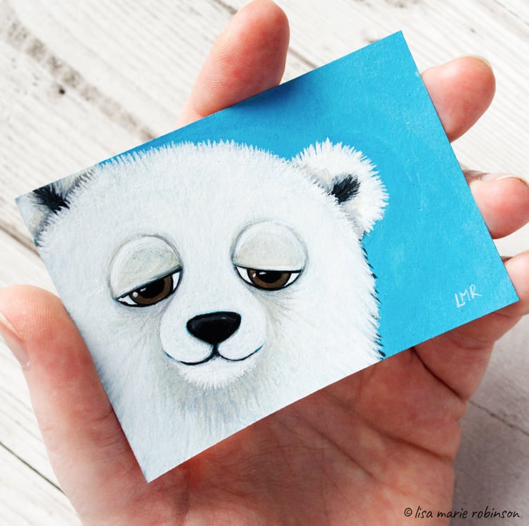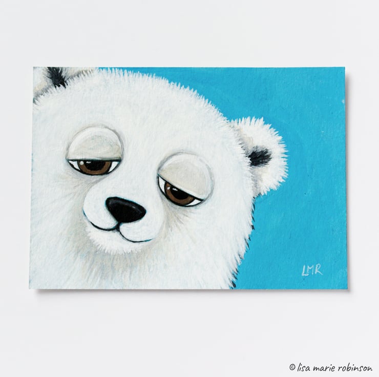 Miniature painting of a cute friendly polar bear. Painted in a whimsical style.