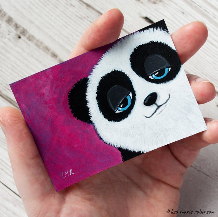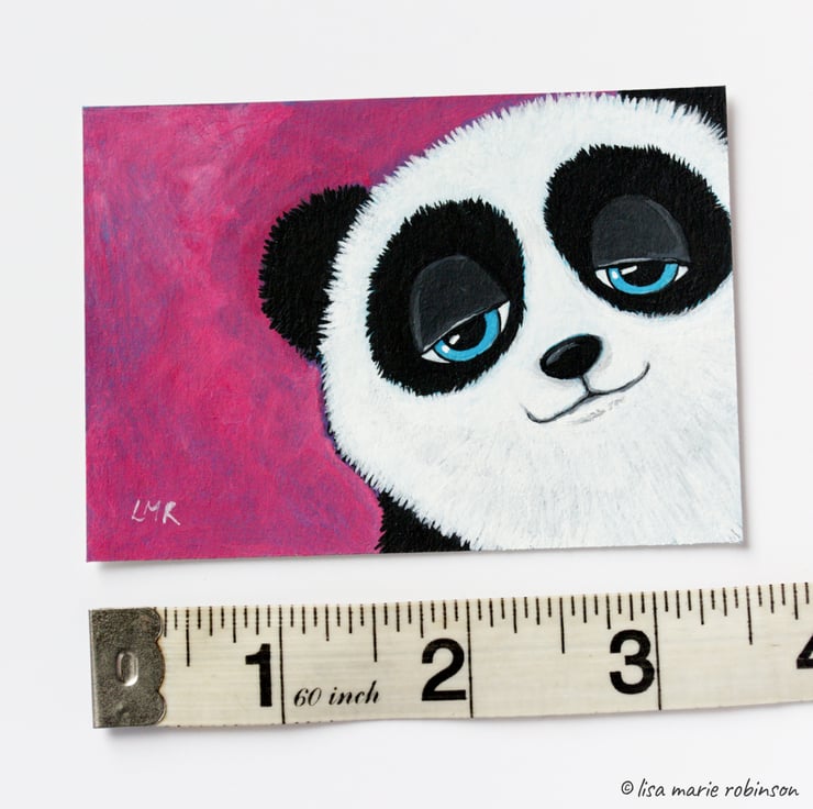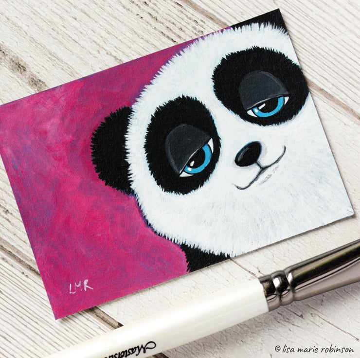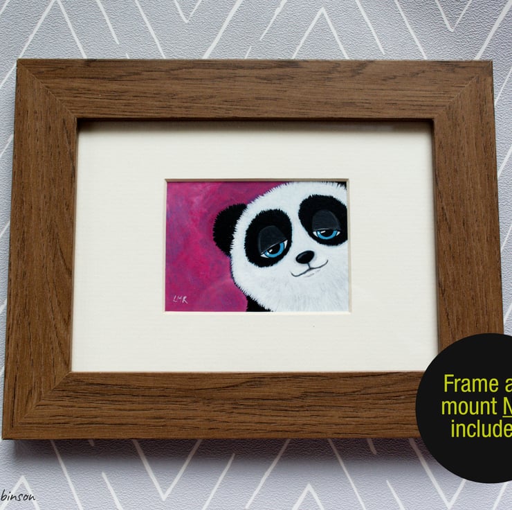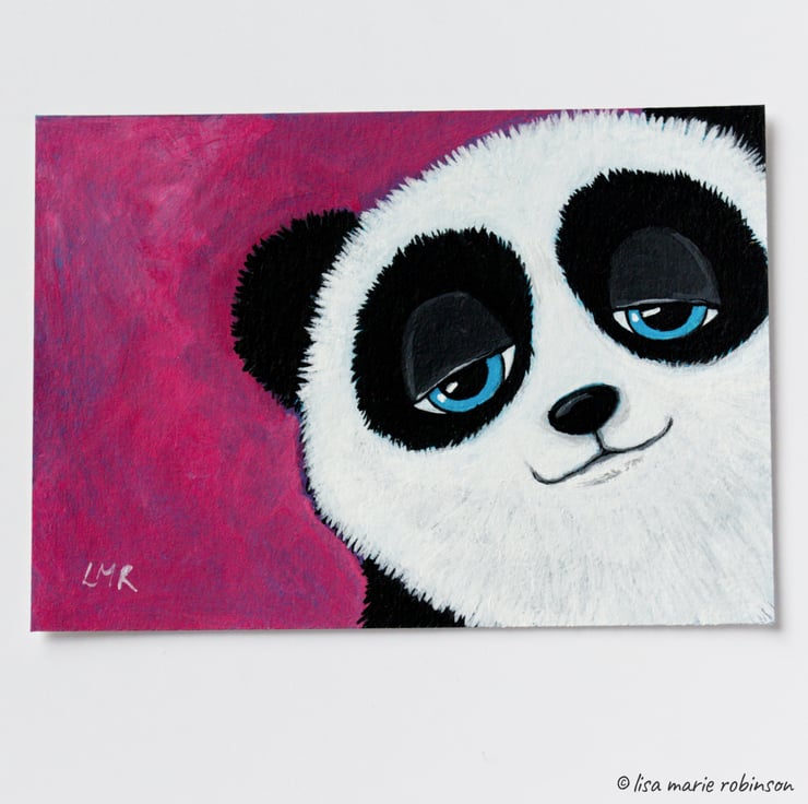 Miniature painting of a cute friendly looking panda bear. His blue eyes perfectly compliment the magenta pink background. Painted in a whimsical style.
