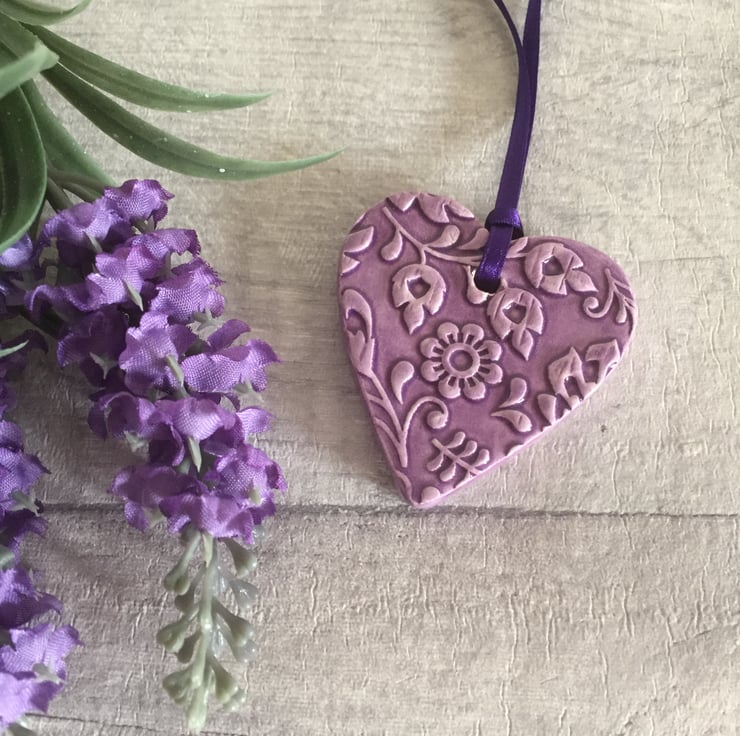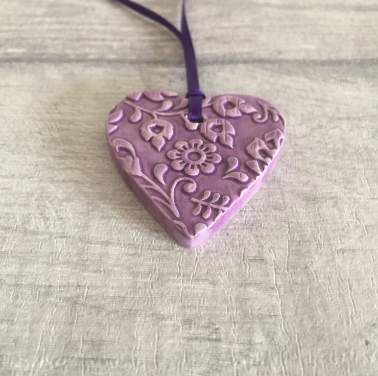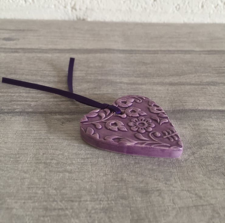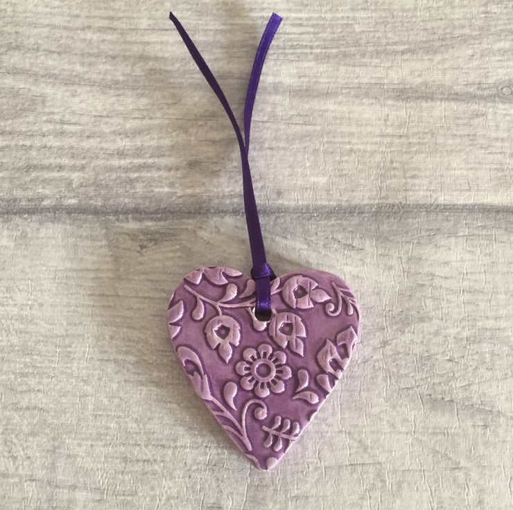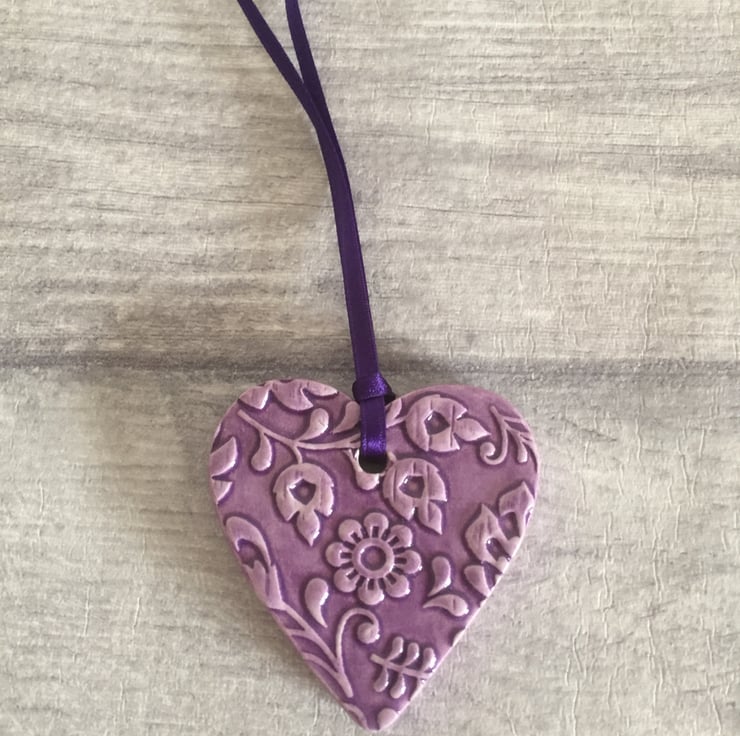 Here we have my handcrafted, ceramic textured hanging hearts. It would make a lovely gift. These hearts have had texture added to the fronts and the backs are plain white.
