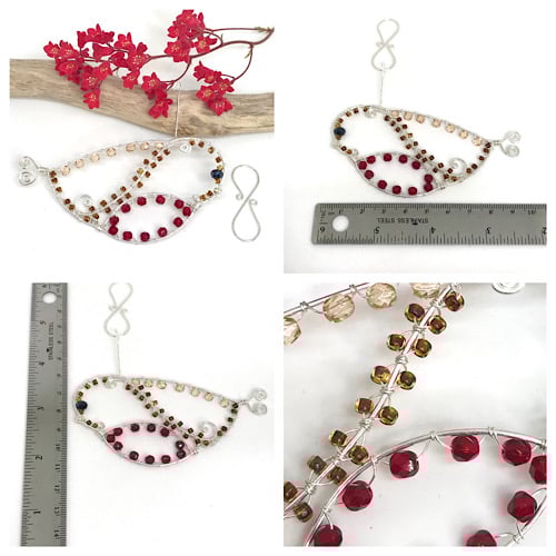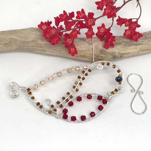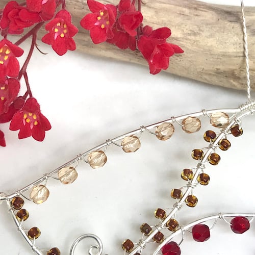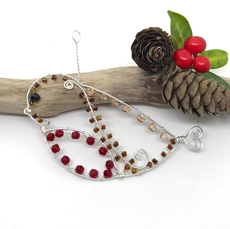 I have used 10% silver filled copper wire to make this Robin. 1mm wire is formed into a Robin shape and with swirls of wire which I have attached for the birds wing and breast and has a heart shaped detail for the tail. I have gently hammered the finished shape with a chasing hammer to strengthen. Red crystal beads, light brown coloured crystal beads and brown seed beads are wrapped around the shape using .4mm wire with a black crystal bead for the eye and a gold coloured seed bead for the beak. I have twisted wire for the loop and completed with a handcrafted hook for hanging.