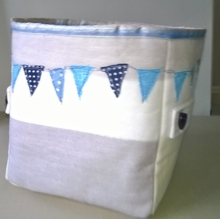 This listing is for a beautiful handmade Caravan storage cube made from 100% beige stripe Pregious Textiles fabric and is fully lined.it has a blue two tone ribbon binding around the top edge , and is interfaced giving it structure whilst it still has a soft feel. It has two side handles with blue wooden button decoration.