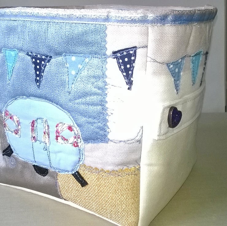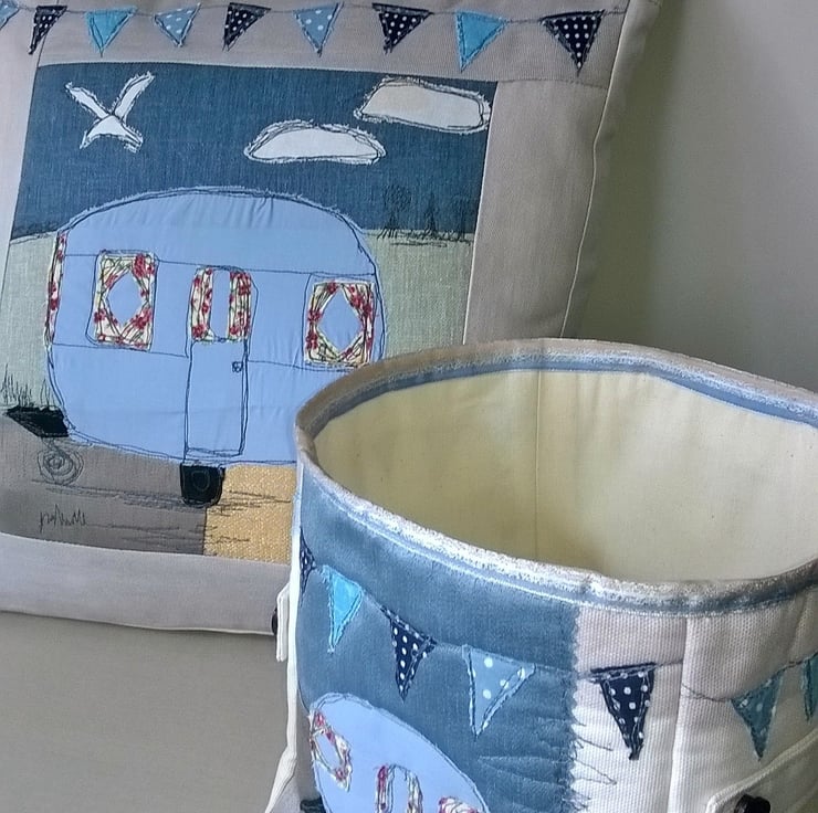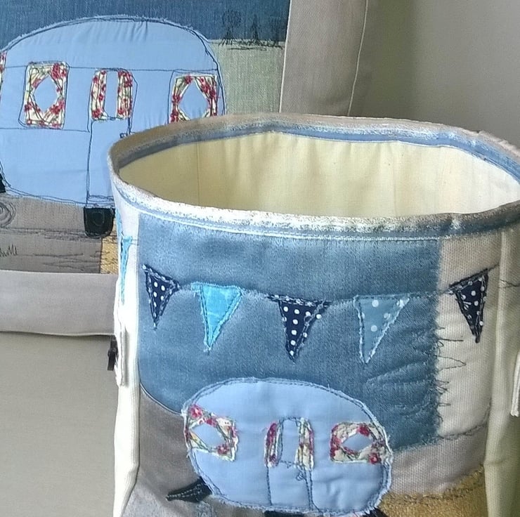 The front has a caravan scene is sewn using free motion stitching and features bunting all the way around the cube.
