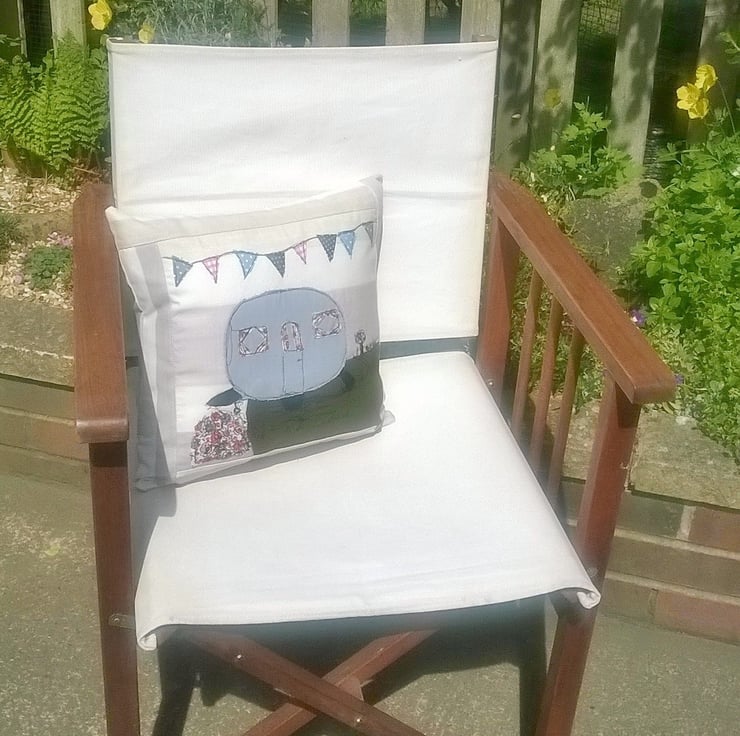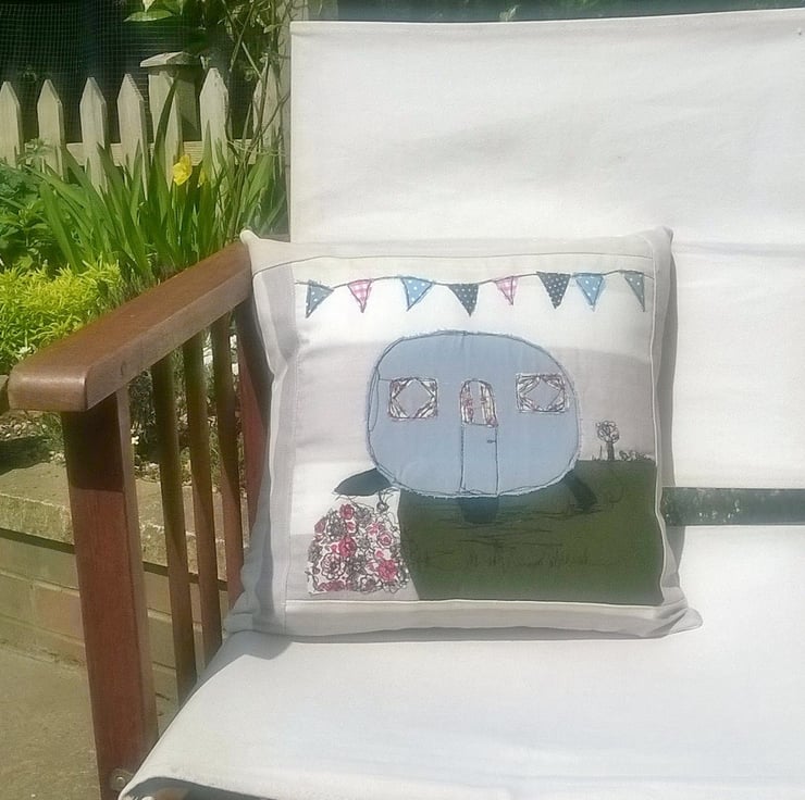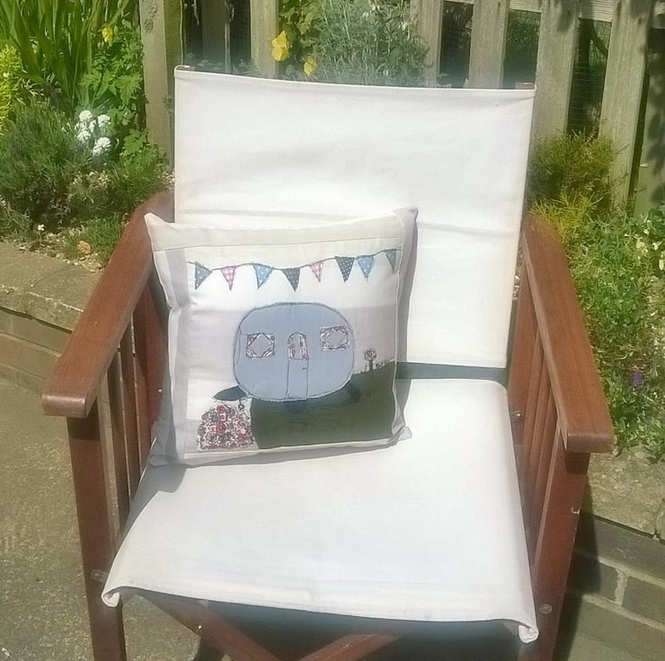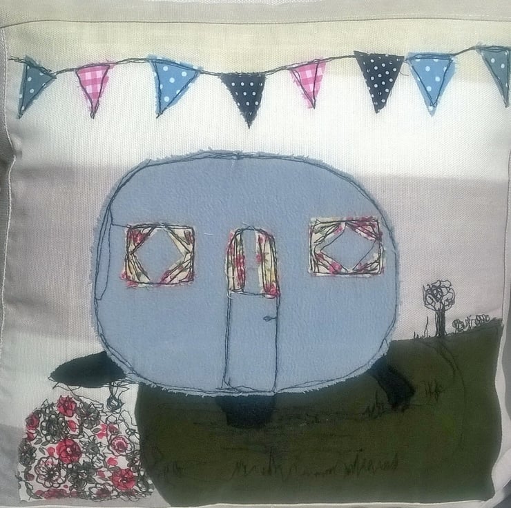 Caravan and Bunting design cushion cover with freestyle machine embroidery appliqued raw edge design, the border and reverse fabric is a beige stripe design from Prestigious Textiles and has a zip closure for easy access.