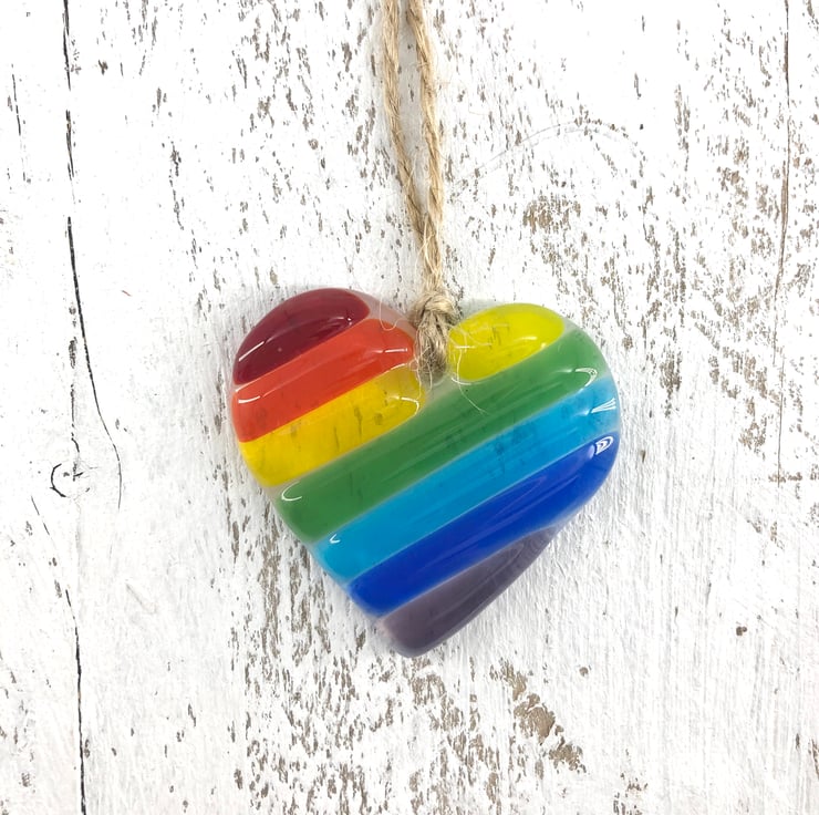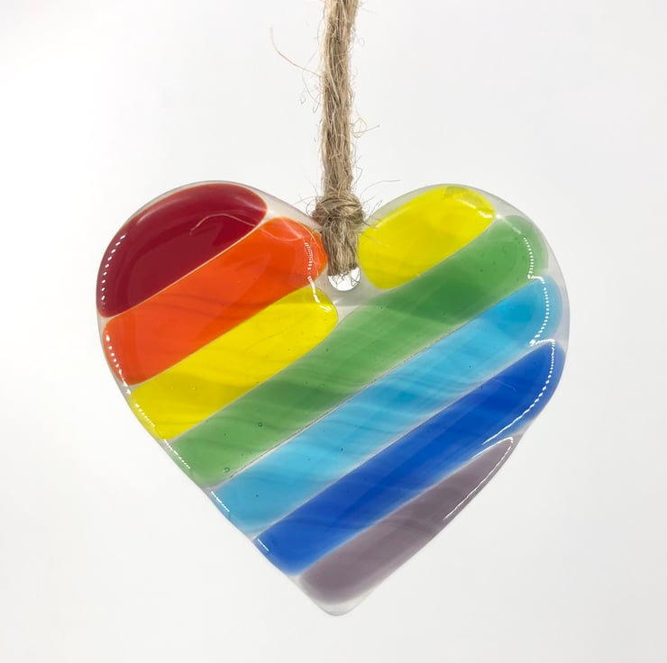 This gorgeous heart is made from wispy white and clear glass with bands of rainbow colours which catch the light beautifully.