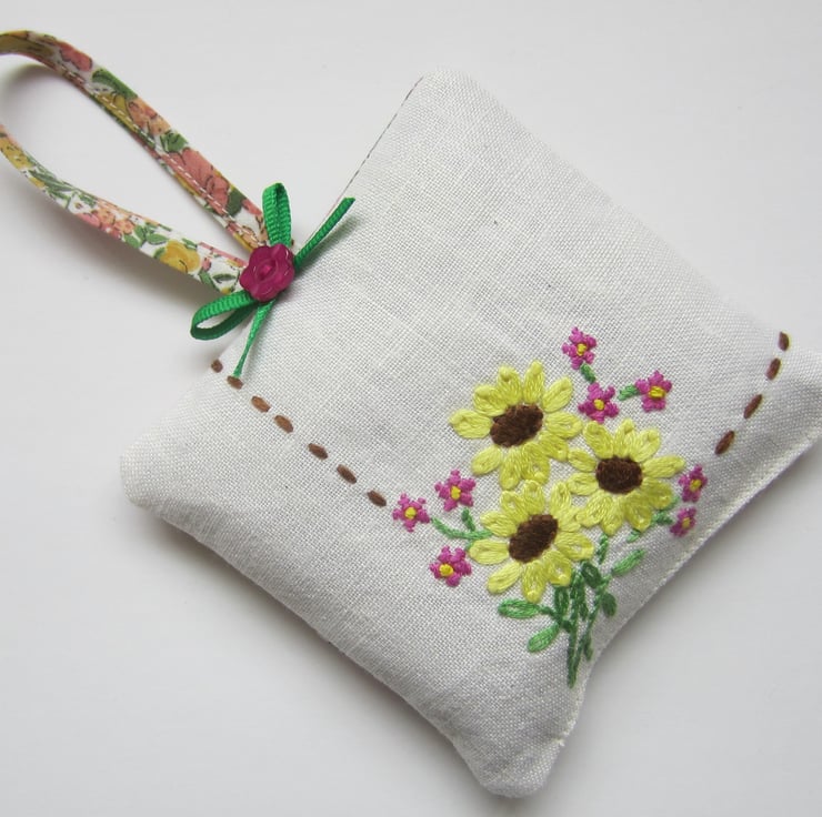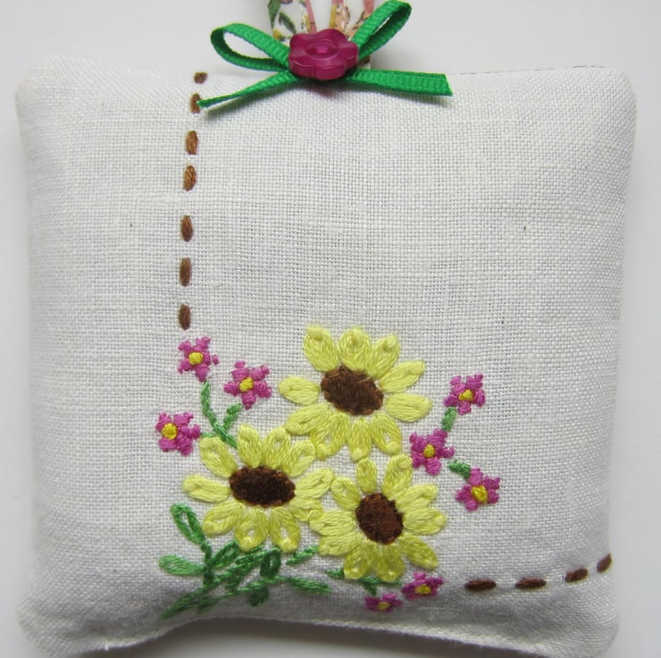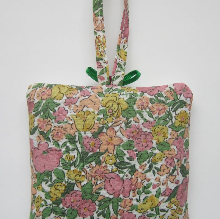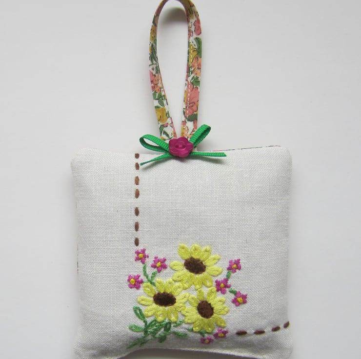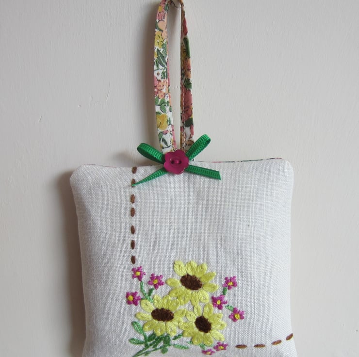 Hanging lavender sachet with a vintage embroidered front in a pretty flower design with an added green ribbon bow and button.The back and loop are in a coordinating floral fabric.