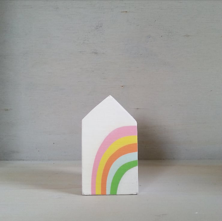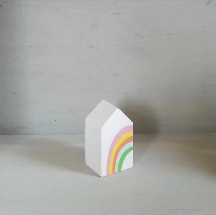 This one of a kind little wooden house is made from reclaimed wood and is painted in white and decorated with a rainbow transfer.
