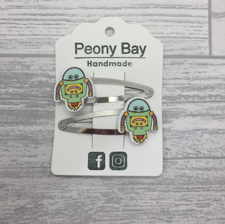 I am a little bit obsessed with cute buttons and as I already make hair accessories I decided to make button clips too! To make these clips I’ve paired multicoloured pastel robots with silver tone snap clips.